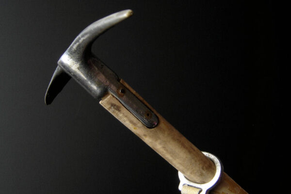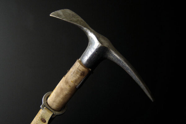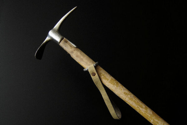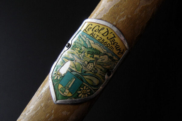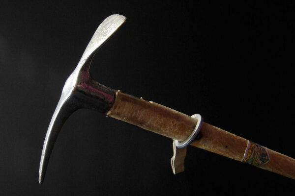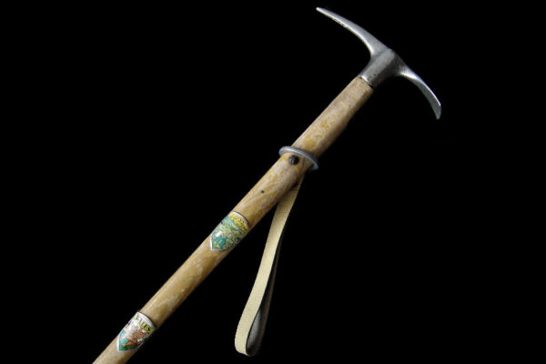 Deze wandelstok / pikhouweel / ijsbijl (pickaxe – Engels / eispickel – Duits) stamt uit het midden van de 20e eeuw omstreeks 1950. De wandelstok / pikhouweel / ijsbijl heeft een leren polslus en drie wandelstok schildjes namelijk: één van Le Col D’izoard Alt 2360 m (De Col d’Izoard is een bergpas gelegen in de Franse Alpen) één van Wales (Wales maakt als constituerend land met Engeland, Noord-Ierland en Schotland deel uit van het Verenigd Koninkrijk) en één van Beddgelert Snowdonia (Beddgelert is een dorpje in het noordwesten van het bergachtige Snowdonia National Park (Eryri), Noord Wales). De wandelstok / pikhouweel / ijsbijl waarvan het hakgedeelte 15.8 cm meet heeft een bergstokpunt van 5.3 cm is 92 cm lang en weegt 402 gram. De wandelstok / pikhouweel / ijsbijl heeft gebruikssporen.