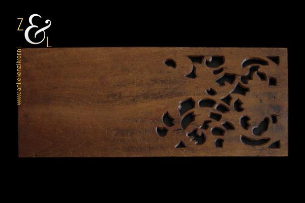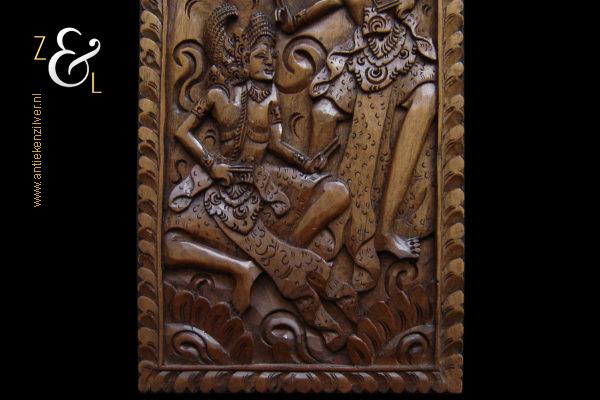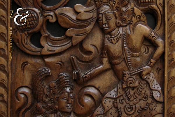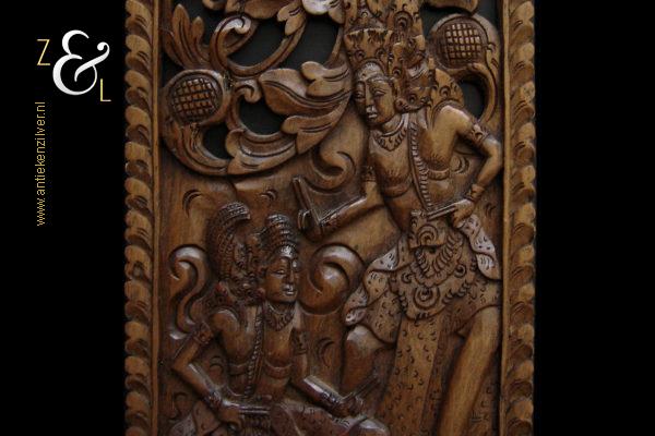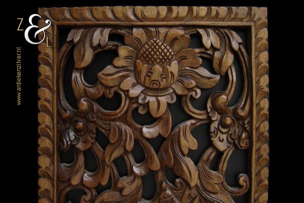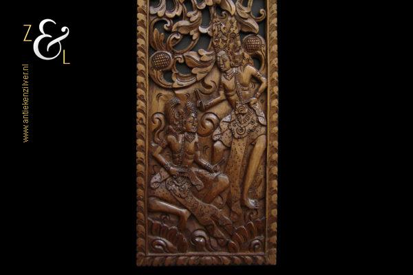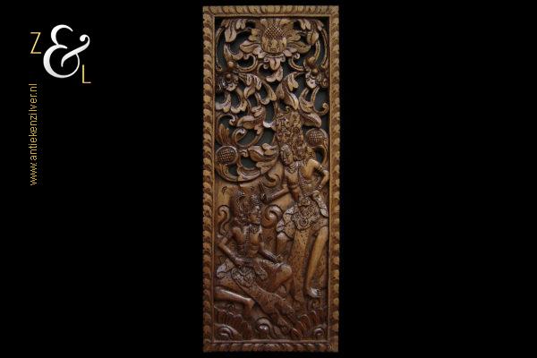 Dit op de hand ajour uitgestoken houten wandpaneel is omstreeks de jaren vijftig van de twintigste eeuw gemaakt op het eiland Bali – Indonesië. Het gedetailleerde houtsnijwerk waarop twee figuren zijn afgebeeld met rondom gestileerde bladeren en midden boven een lotusbloem weegt 427 gram is 48.2 cm lang bij 19 cm breed en 1.4 cm dik. Het wandpaneel is iets kromgetrokken.