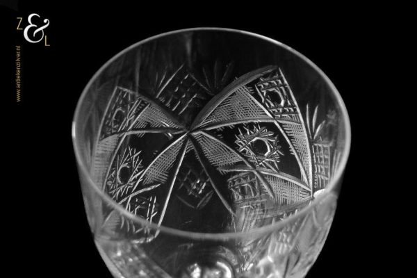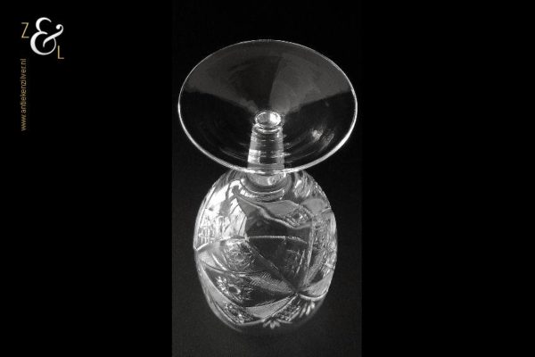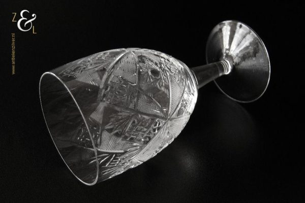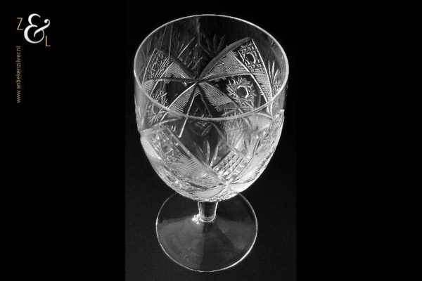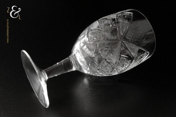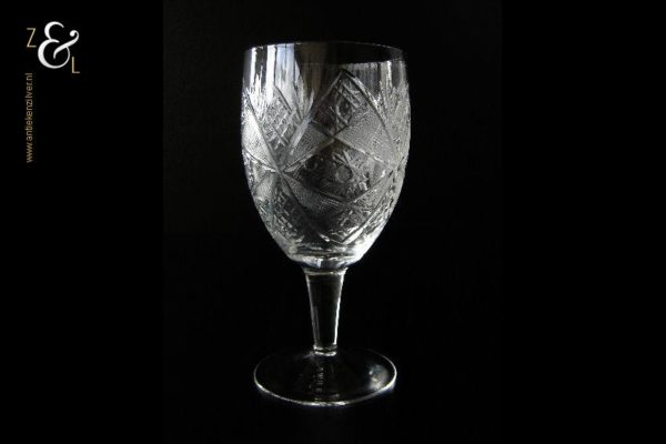 Dit kristallen fantasie geslepen wijnglas stamt uit de tweede helft van de twintigste eeuw. Het handgeslepen en gepolijst glas weegt 116 gram heeft een diameter van 7 cm en is 14.5 cm hoog.