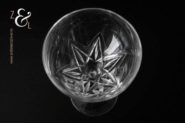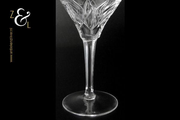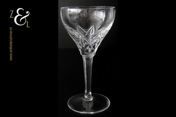 Dit wijnglas is gemaakt in Nederland en stamt uit de tweede helft van de 20e eeuw omstreeks de zestiger- zeventiger jaren. Het in Art Deco stijl en in helder kristal vervaardigde wijnglas heeft een ronde voet, zeskantige steel en een kelk met daarop een handgeslepen stermotief. Het wijnglas weegt 168 gram en is 14.5 cm hoog. De kelk heeft een diameter van 7.5 cm de voet heeft een diameter van 6.5 cm. Het wijnglas heeft gebruikssporen (krasjes in de kelk).