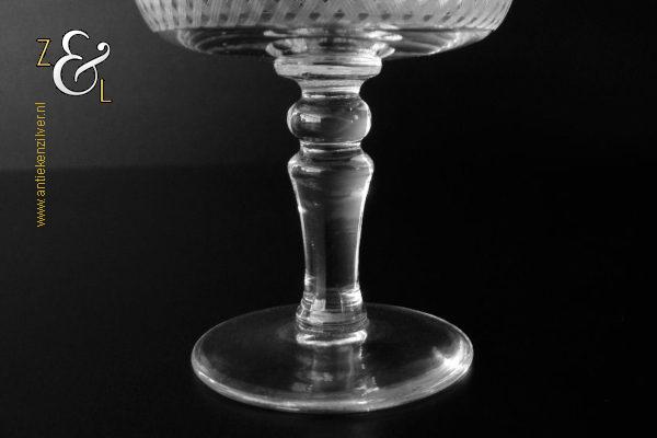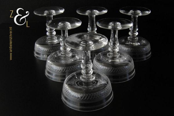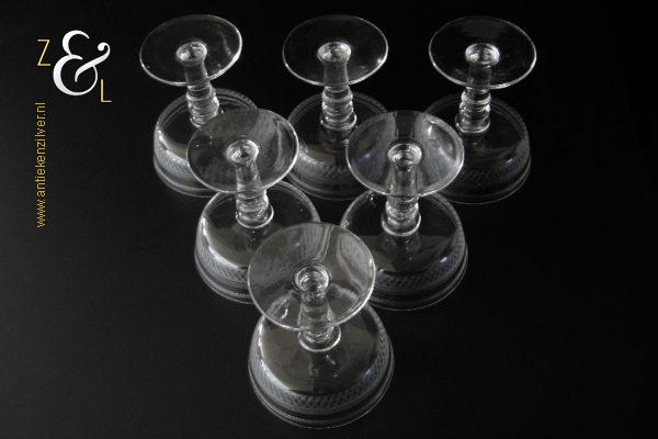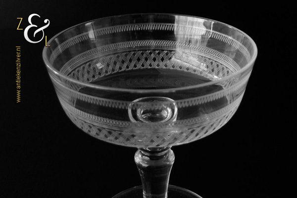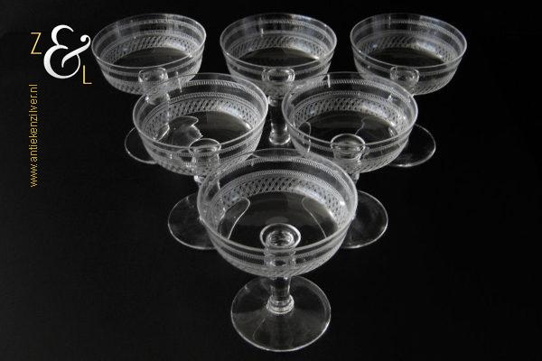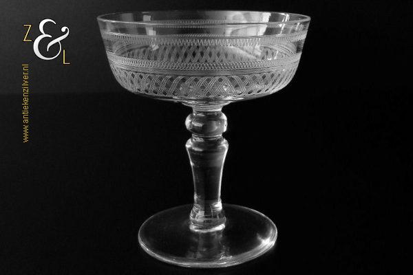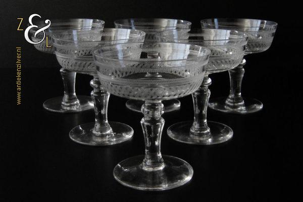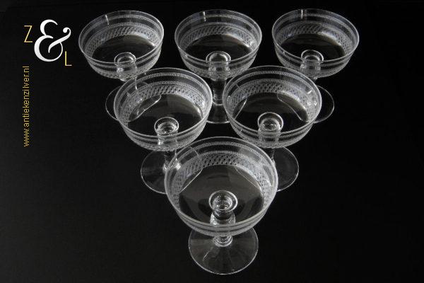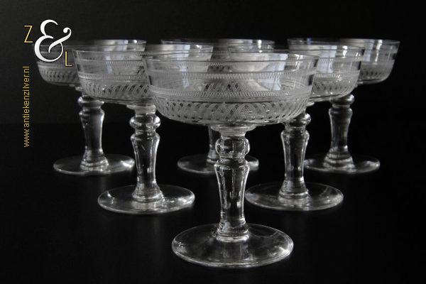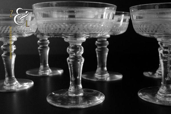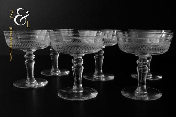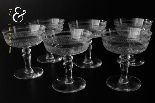 Deze zes kristallen champagneglazen / champagnecoupes zijn vermoedelijk gemaakt in Leerdam bij de Kristal en Glasfabriek Leerdam aan het einde van de 19e en het begin van de 20e eeuw. De met verschillende motieven geguillocheerde en geëtste glazen hebben een balustervormige steel met onder de kelk een knoop. De champagneglazen / champagnecoupes wegen samen 830 gram en zijn 10.2 cm hoog. De bovenzijde van de glazen hebben een diameter van 9 cm en de voet heeft een diameter van 6.8 cm. De zes champagneglazen / champagnecoupes zijn op ambachtelijke wijze op de hand in een vorm mondgeblazen, hierdoor kunnen er kleine imperfecties optreden en hebben de glazen onderling een klein verschil in gewicht.