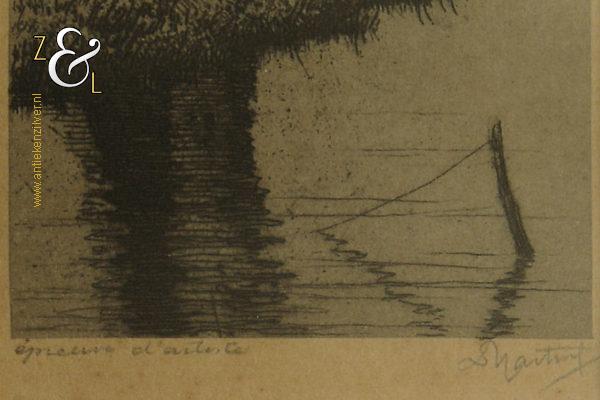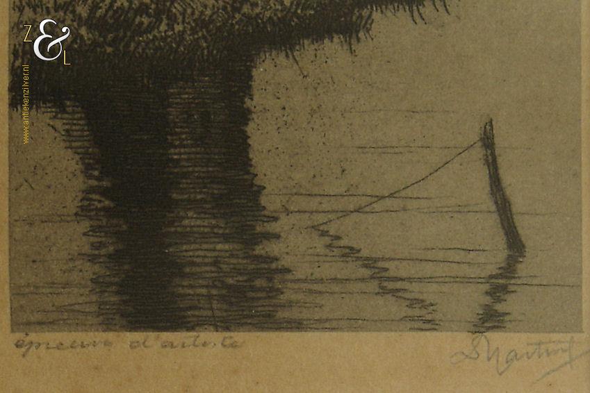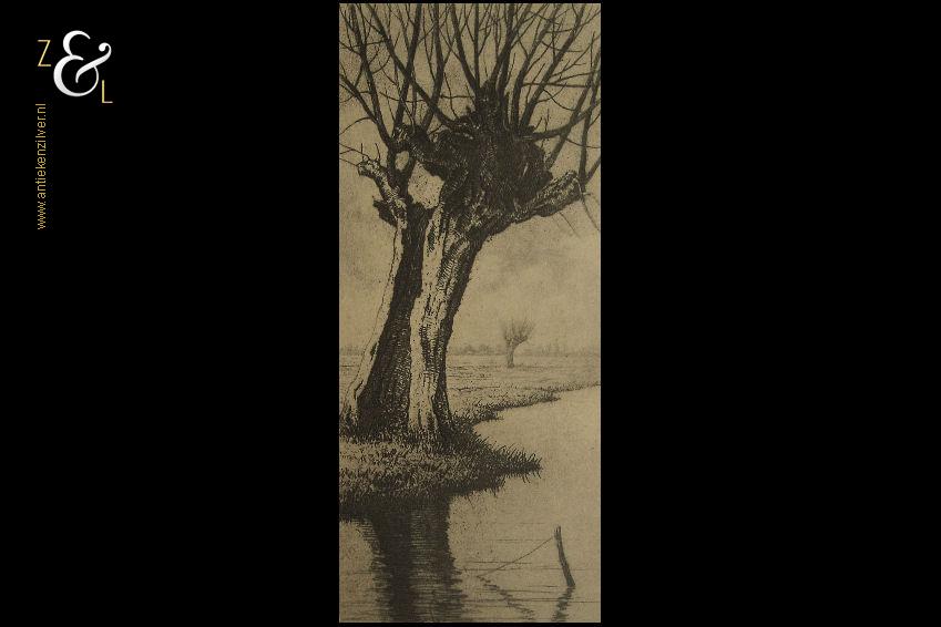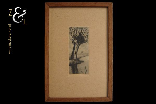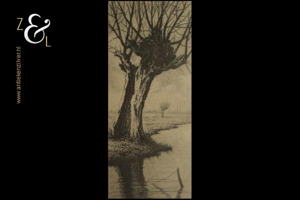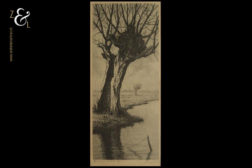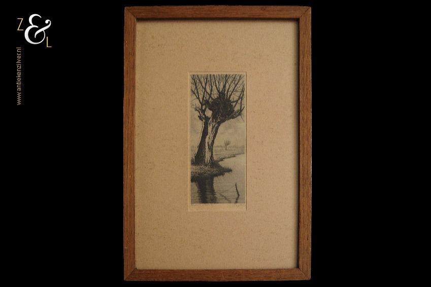 Deze ets met de voorstelling van een knotwilg aan de waterkant is gemaakt door Dirk Harting. De ets is gedrukt op papier en voorzien van een houten lijst en passe partout gemaakt door een professionele lijstenmaker. Aan de achterzijde zit het etiket van A. Tendeloo restaurateur van schilderijen en lijsten encadreur in Haarlem die de eerste helft van de twintigste eeuw daar werkzaam was. De ets is rechtsonder in potlood gesigneerd D. Harting, linksonder staat Épreuve d’artiste*. De ets is aan de binnenzijde van het passe partout gemeten 11.5 cm lang bij 5 cm breed. De lijst is 23 cm lang bij 16 cm breed. De lijst heeft lichte, gebruikelijke ouderdomssporen.