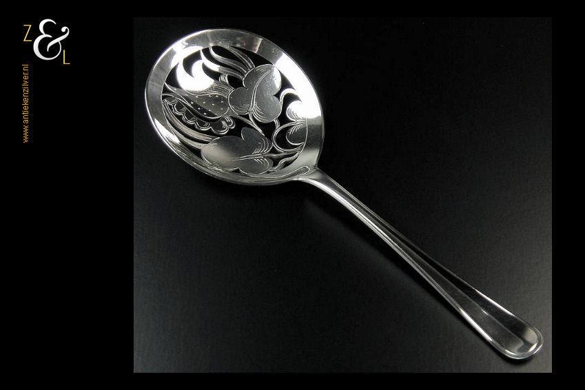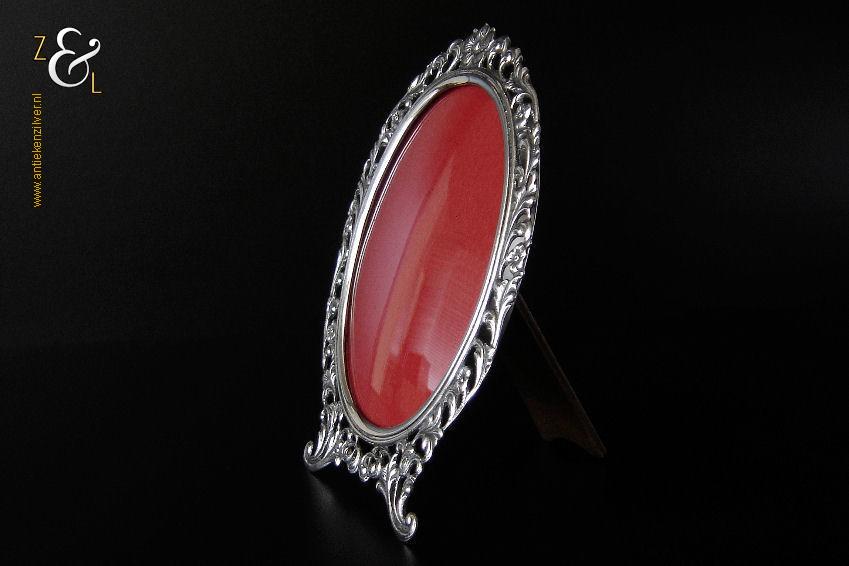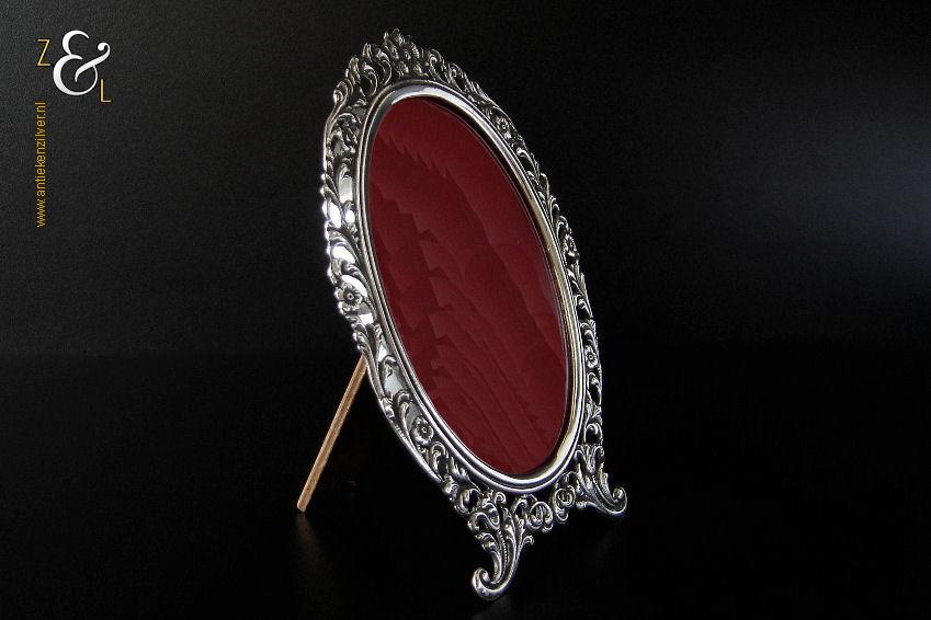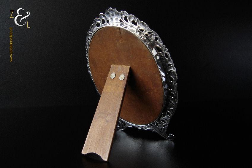 Deze fotolijst is gemaakt in Nederland en stamt uit de eerste helft van de 20e eeuw. De ajour gegoten verzilverde fotolijst weegt inclusief glas en achterkant 169 gram. De fotolijst is 16.2 cm lang bij 12.3 cm breed. De lijst is geschikt voor ovale foto’s van 11.4 cm bij 8.7 cm en heeft nog het originele bolle glas.