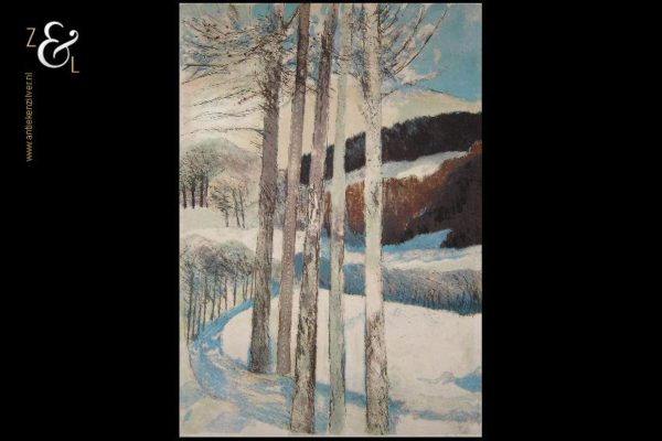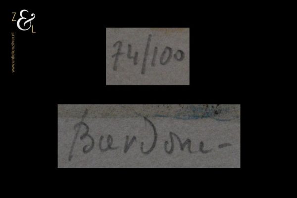 Deze litho met de afbeelding van een winterlandschap is gemaakt door Guy Bardone. De litho is in potlood rechtsonder gesigneerd: Bardone, linksonder staat de oplage: 74/100. De litho is 75.6 cm lang bij 54.2 cm breed. De litho is licht verkleurd.