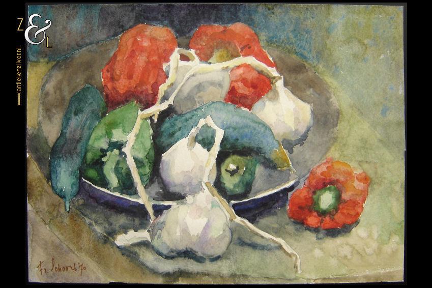 Deze aquarel met de afbeelding van groenten op een schaal is gemaakt door Frans Schoorl. De aquarel is linksonder gesigneerd en gedateerd Fr, Schoorl. ’70 en is 47 cm lang bij 34 cm breed.