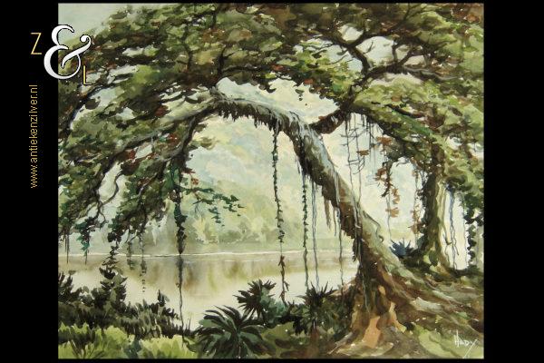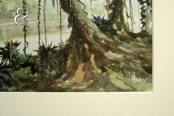 Deze aquarel / gouache* met de voorstelling van een overhangende boom met lianen bij een rivier is omstreeks de vijftiger jaren in Indonesië gemaakt door Hady Suwarno. De aquarel / gouache is geschilderd op board en voorzien van een passe partout gemaakt door een professionele lijstenmaker. De aquarel / gouache is rechtsonder met witte gouache verf gesigneerd Hady en is aan de binnenzijde van het passe partout gemeten 28.3 cm lang bij 23.7 cm breed, de buitenzijde van het passe partout is 40.3 cm lang bij 36.7 cm breed.