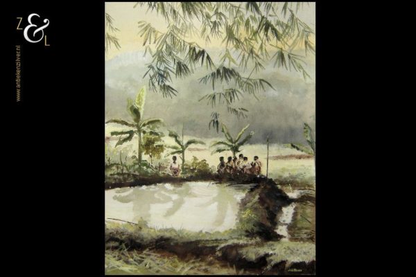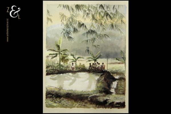 Deze aquarel met de voorstelling van vissende jongens is gemaakt in Indonesië en valt onder de zogenaamde Indische / Indonesische school. De aquarel is in aquarelverf rechtsonder gesigneerd door een voor ons nog onbekende kunstenaar. De aquarel die uit de helft van de 20e eeuw stamt (omstreeks 1940 – 1950) is 43 cm lang bij 32.6 cm breed.
