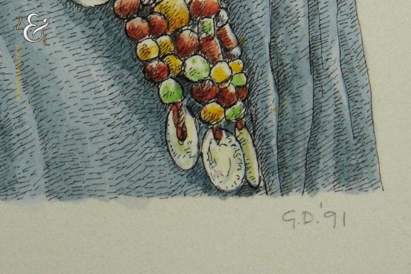 Bij het schilderij is inbegrepen het Nederlandstalige boek Hardcover, Ger Daniëls Volksversieringen uit alle werelddelen, Vorm en motief van sieraad en tooi. Met een voorwoord van Drs. Roelof Munneke Conservator Rijksmuseum voor Volkenkunde. Dit 200 pagina’s tellende boek is in 1989 uitgegeven door C. de Vries-Brouwers Antwerpen. De bovenstaande aquarel / pentekening Marocco / Marokko staat niet afgebeeld in dit boek! Het boek heeft gebruikssporen.