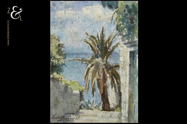 Deze aquarel met de afbeelding van een uitzicht op zee met palmboom is in 1968 gemaakt door Roelof Klein. Vermoedelijk heeft hij deze aquarel op vakantie in Portugal geschilderd. De aquarel is linksonder met aquarelverf gesigneerd en gedateerd: Roelof Klein ’68 en is 37.5 cm lang bij 28 cm breed.
