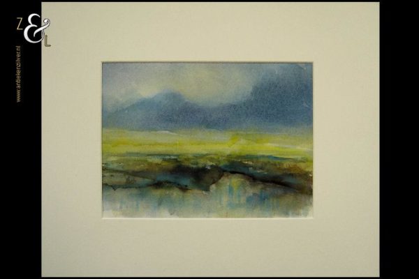 Deze aquarel met de titel “Duinlandschap” is gemaakt door Willie van Haard. De aquarel is in potlood rechtsonder gesigneerd en gedateerd Willie van Haard ’13. De aquarel is gemeten aan de binnenzijde van het passe partout 29.8 cm lang bij 21.7 cm breed. De buitenzijde van het passe partout is 49 cm lang bij 39.5 cm breed.