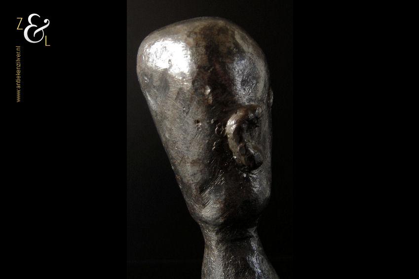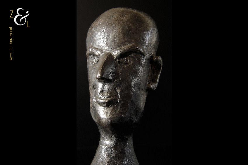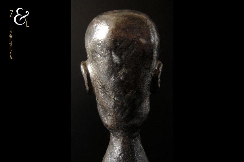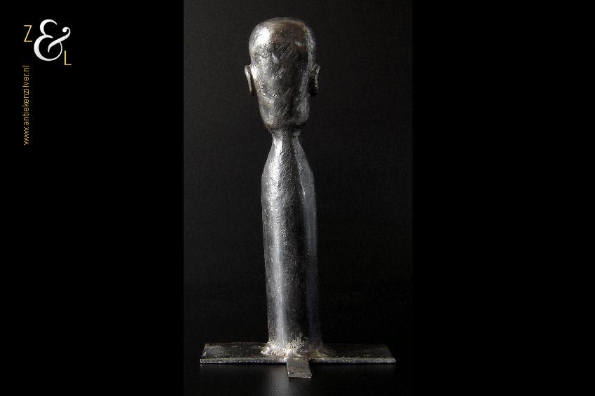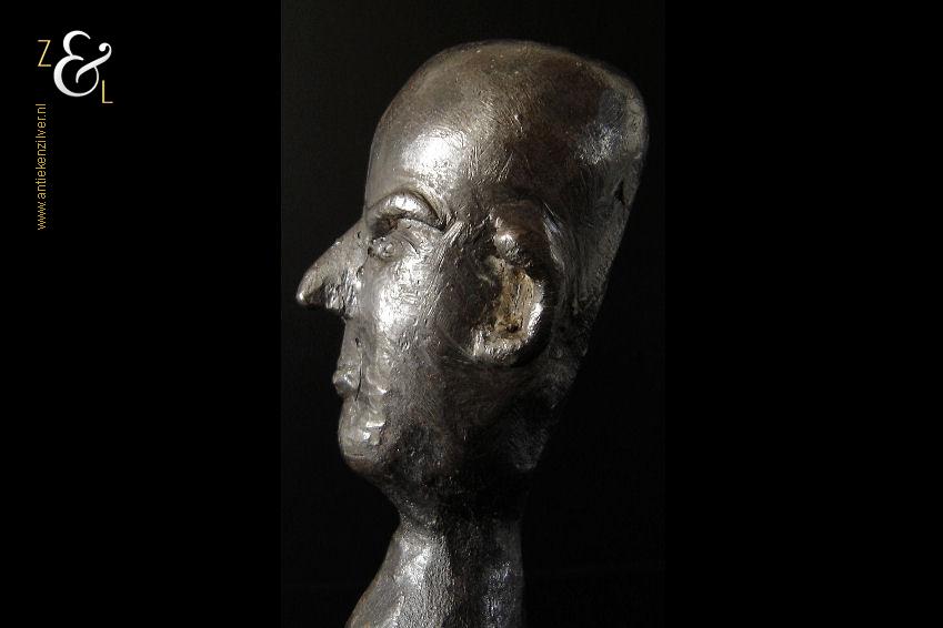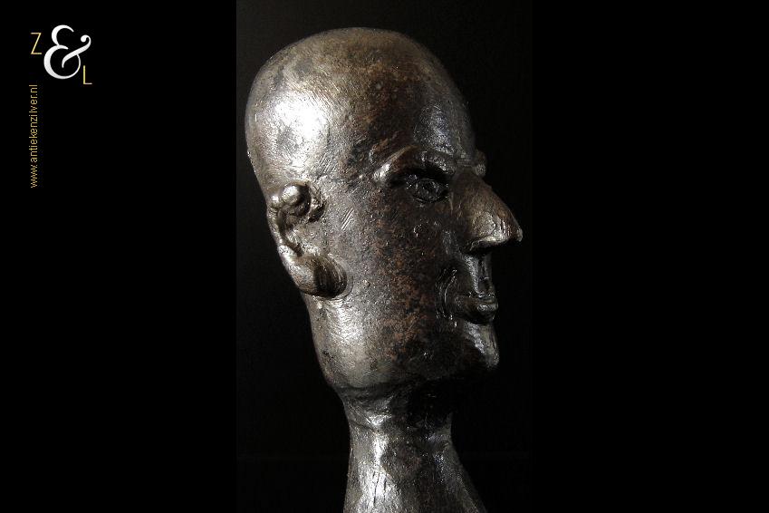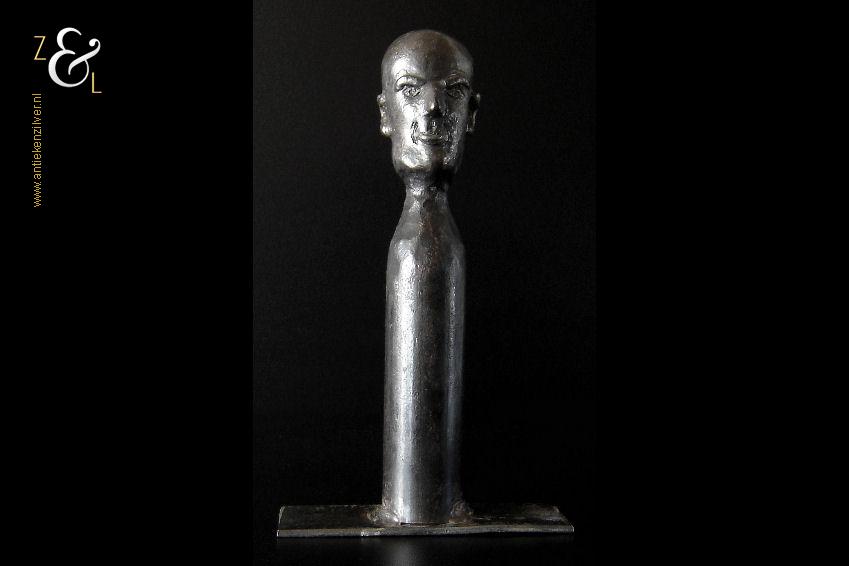 Dit handgesmede beeld / plastiek van een mannenhoofd is gemaakt door een voor ons nog onbekende kunstenaar / smid. Het zwart grijs gepatineerde ijzeren beeld / plastiek is gesmeed uit een stuk ijzeren buis dat gelast zit op een paar ijzeren rechthoeken die als voet dienst doen. Het beeld / plastiek weegt 561 gram is 20.8 cm hoog en de voet is 11.9 cm lang bij 6.8 cm breed.