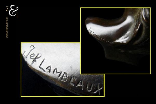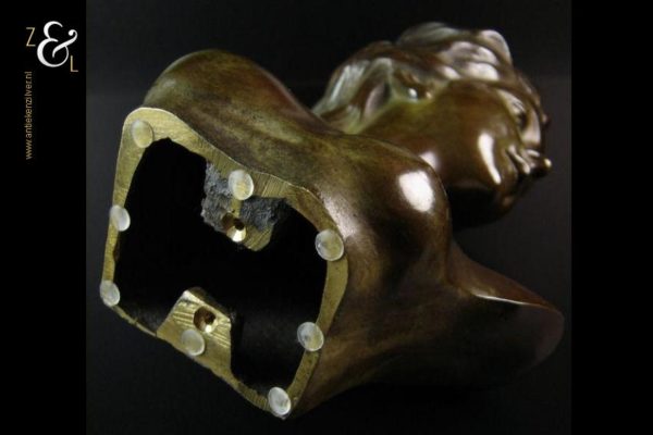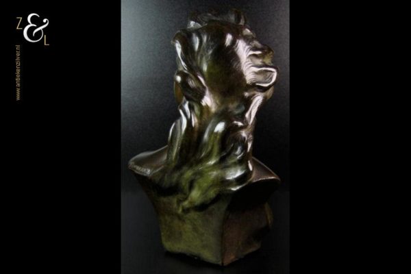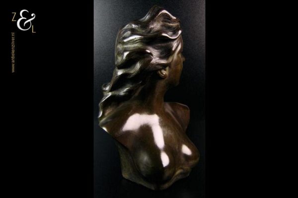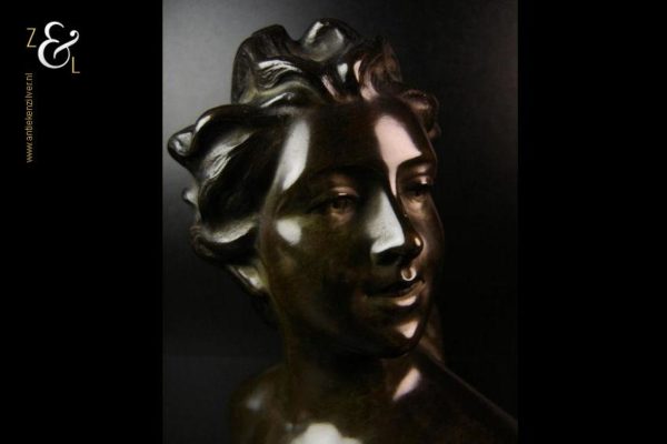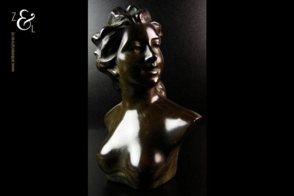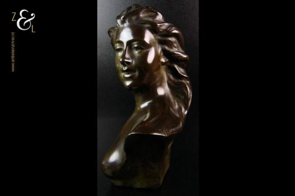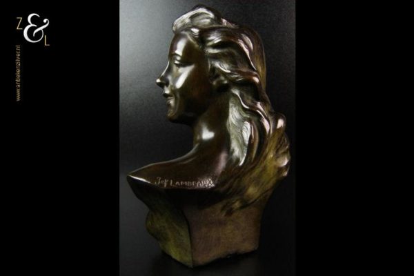 Deze groen bruin gepatineerde bronzen buste van een vrouw is een ontwerp van Jef Lambeaux. Het stamt uit het begin van de 20e eeuw. De buste is duidelijk gesigneerd op de linkerschouder weegt plusminus 3200 gram en is 21.5 cm hoog 15 cm breed en 10.5 cm diep. Aan de onderkant van dit beeld zitten twee bevestigingspunten voor een marmeren voet of sokkel, deze is zoals bij zoveel bronzen beelden in de loop der jaren verloren gegaan.