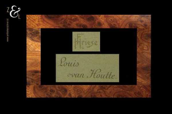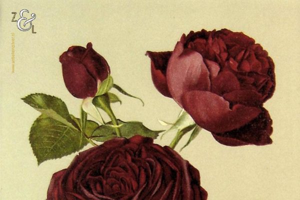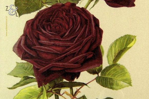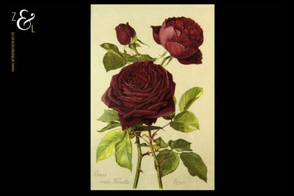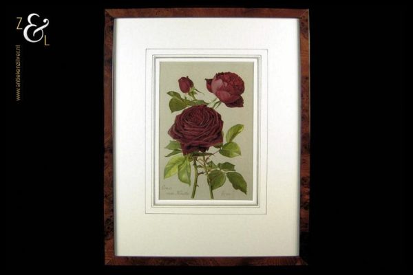 Deze chromolitho van H. Friese met de voorstelling van een rode roos genaamd Louis van Houtte stamt uit de 19e eeuw. De gekleurde litho is gedrukt op papier en is ingelijst door een professionele lijstenmaker in een wortelnoten lijst en voorzien van een passe partout. De afmeting van de litho is 21.5 cm bij 14.5 cm de buitenkant van de lijst meet 40.7 cm bij 31.7 cm.