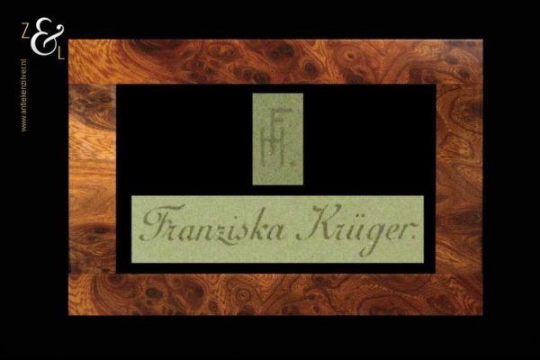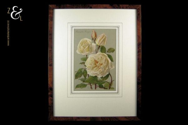 Deze chromolitho van H. Friese met de voorstelling van een roze roos genaamd Franziska Krüger stamt uit de 19e eeuw. De gekleurde litho is gedrukt op papier en is ingelijst door een professionele lijstenmaker in een wortelnoten lijst en voorzien van een passe partout. De afmeting van de litho is 21.5 cm bij 14.5 cm de buitenkant van de lijst meet 40.7 cm bij 31.7 cm.
