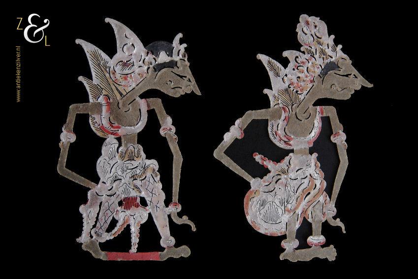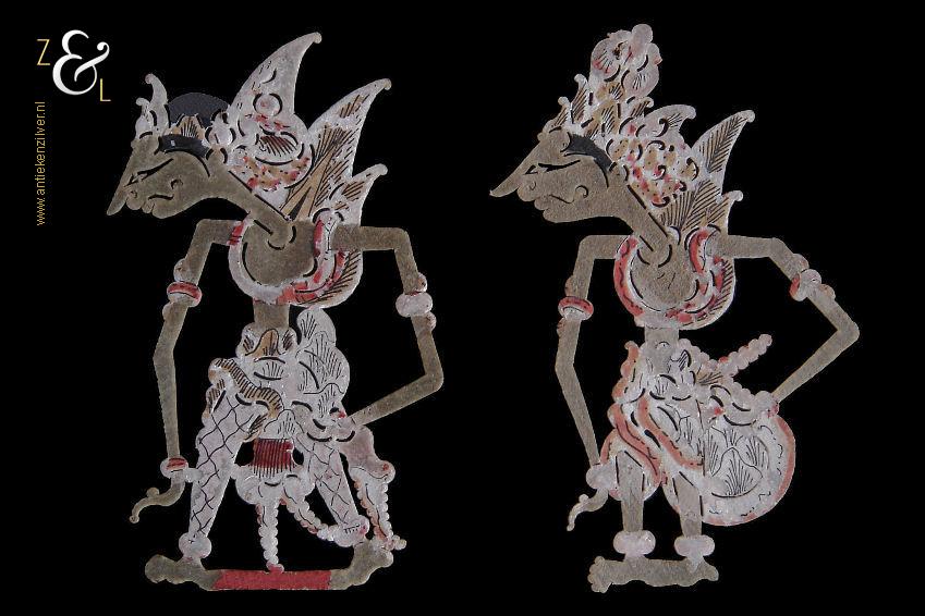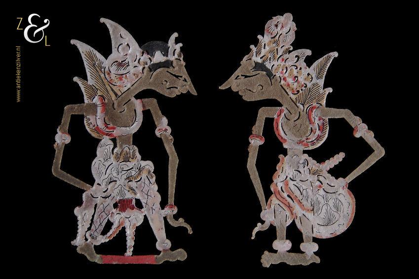 Dit stel kleine Wajangpoppen is gemaakt in Indonesië en stamt uit de 20e eeuw. De rood, wit goud beschilderde Wajangpoppen die vermoedelijk omstreeks de jaren vijftig verkocht zijn als souvenir (kinderspeelgoed), zijn 13 cm lang bij 7.5 cm breed. Het stel wajangpoppen heeft slijtagesporen.