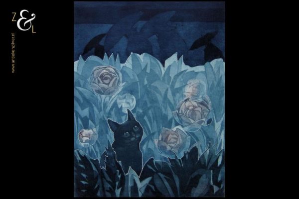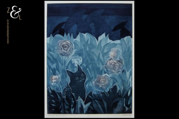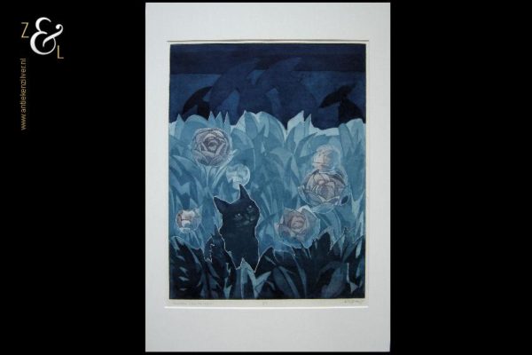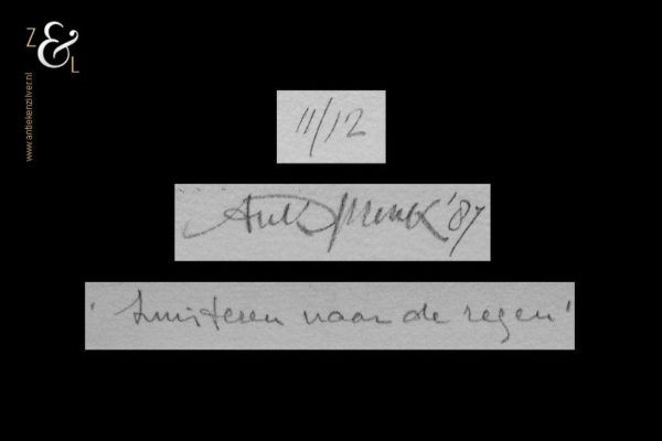 Deze ets met de titel “Luisteren naar de regen” is gemaakt door Auk Pronk. De ets is in potlood rechtsonder gesigneerd en gedateerd Auk Pronk ’87 in het midden staat de oplage 11/12 en linksonder staat de titel “Luisteren naar de regen”. De ets is gemeten aan de binnenzijde van het passe partout 52 cm lang bij 40.5 cm breed. De buitenzijde van het passe partout is 70 cm lang bij 50 cm breed.