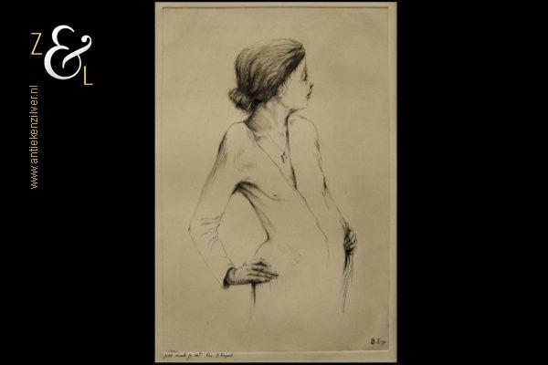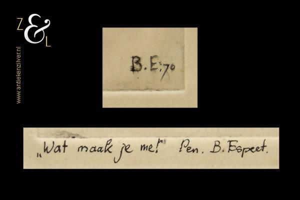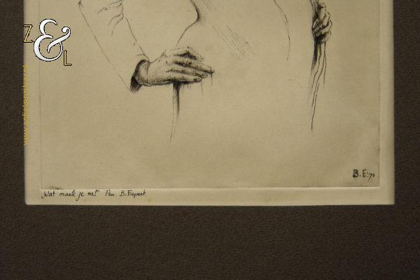 Deze ets met de titel “Wat maak je me” is gemaakt door Brigitte Espeet. De ets heeft linksonder met inkt de titel “Wat maak je me” met daarnaast Pen. en de signatuur B. Espeet. Tevens is de ets in de etsplaat rechtsonder gesigneerd met B.E.’70. De ets is voorzien van een donkerbruin passe partout en is aan de binnenzijde van het passe partout gemeten 23.2 cm lang bij 15.8 cm breed. De buitenzijde van het passe partout is 45 cm lang bij 35 cm breed.