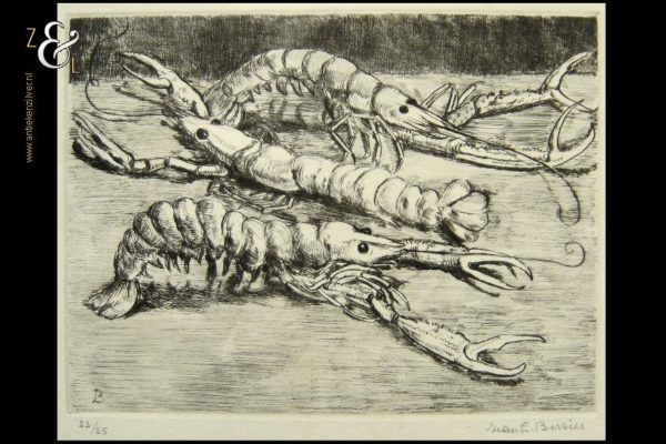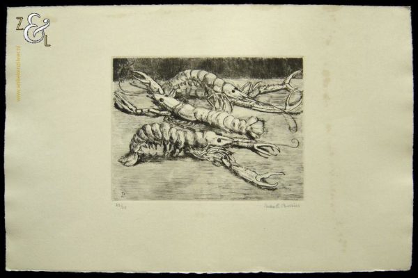 Deze ets met de afbeelding van kreeften is gemaakt door Jean Eugene Bersier. De ets is in potlood rechtsonder gesigneerd Jean E. Bersier, linksonder staat de oplage 22/25. De ets is tevens in de etsplaat linksonder gesigneerd met een B. De ets is aan de buitenzijde gemeten 49.7 cm lang bij 32.2 cm breed, de ets is 23 cm lang bij 17 cm breed. De ets heeft aan de buitenzijde wat vlekken. De conditie van de ets is goed.