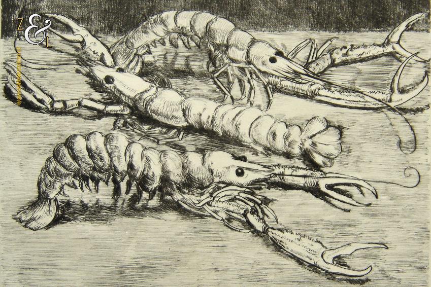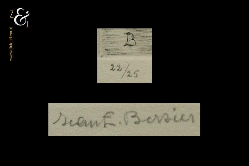 Deze ets met de afbeelding van kreeften is gemaakt door Jean Eugene Bersier. De ets is in potlood rechtsonder gesigneerd Jean E. Bersier, linksonder staat de oplage 22/25. De ets is tevens in de etsplaat linksonder gesigneerd met een B. De ets is aan de buitenzijde gemeten 49.7 cm lang bij 32.2 cm breed, de ets is 23 cm lang bij 17 cm breed. De ets heeft aan de buitenzijde wat vlekken. De conditie van de ets is goed.