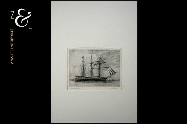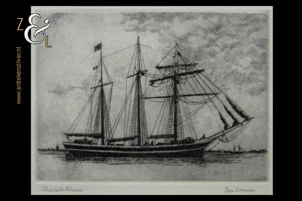 Ets met de titel “Charlotte Rhodes”* gemaakt door Poppe Harmanus Damave. De ets is rechtsonder in potlood gesigneerd: Poppe Damave en linksonder staat de titel: Charlotte Rhodes. De ets is aan de binnenzijde van het passe partout gemeten 21 cm lang bij 16 cm breed. De buitenzijde van het passe partout is 49.8 cm lang bij 34.9 cm breed.