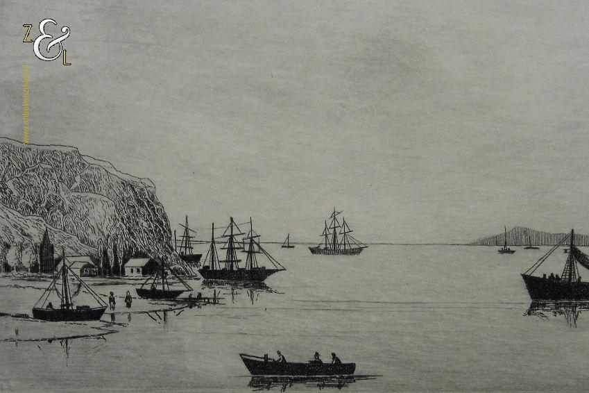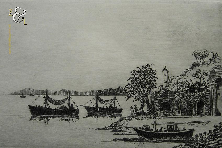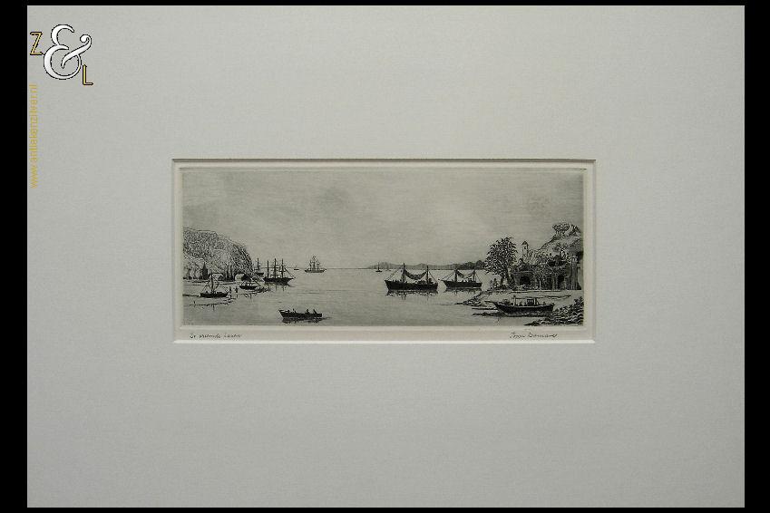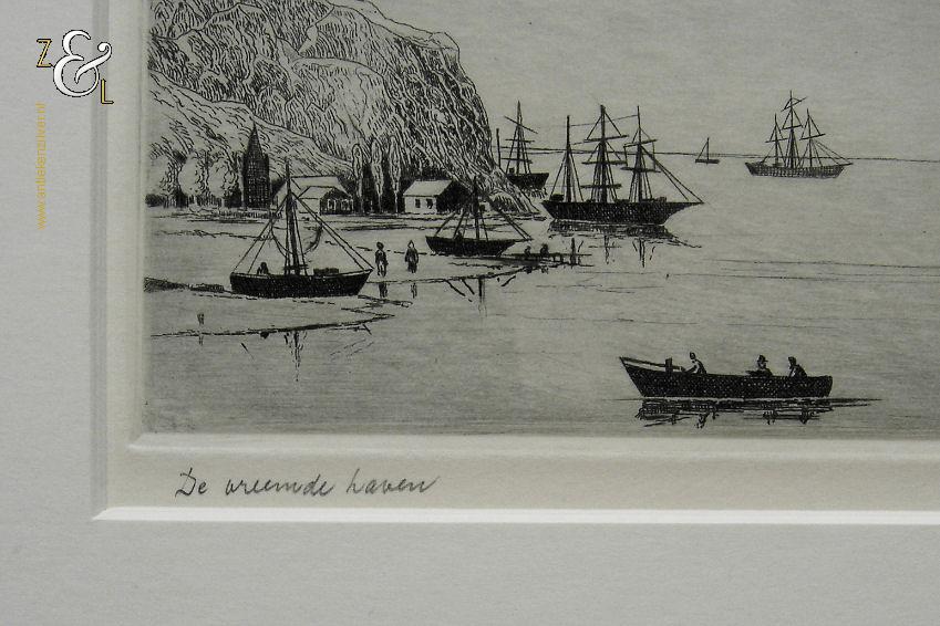 Ets met de titel “De vreemde haven” gemaakt door Poppe Harmanus Damave. De ets is rechtsonder in potlood gesigneerd: Poppe Damave en linksonder staat de titel “De vreemde haven”. De ets is aan de binnenzijde van het passe partout gemeten 28 cm lang bij 12 cm breed. De buitenzijde van het passe partout is 49.8 cm lang bij 34.8 cm breed.