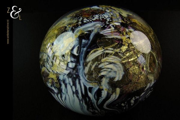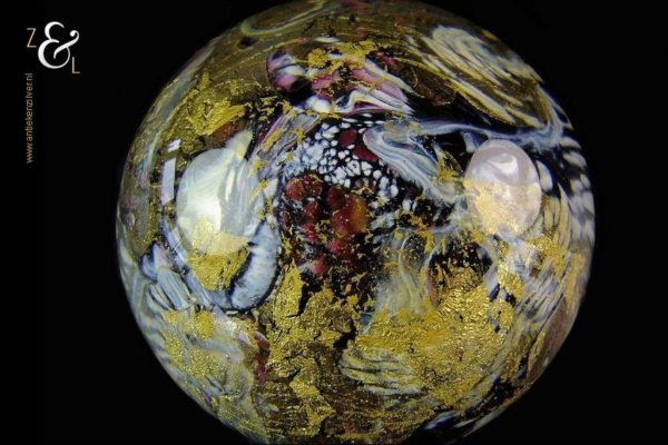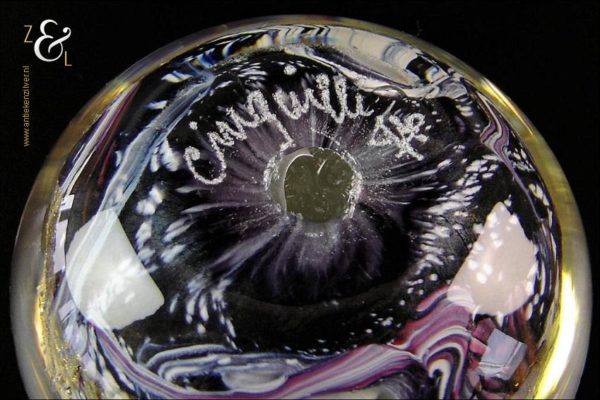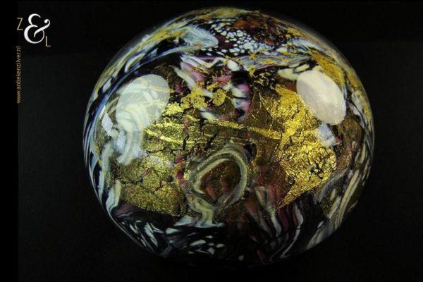 Deze glazen unica presse papier is gemaakt door de Franse glaskunstenaar Jean-Pierre Cinquilli. Hij is uitgevoerd in diverse kleuren en er is gebruik gemaakt van 24 karaat bladgoud wat deze presse papier bijzonder maakt. De presse papier die aan de onderzijde gesigneerd is heeft een diameter van 10.7 cm en weegt 1358 gram.