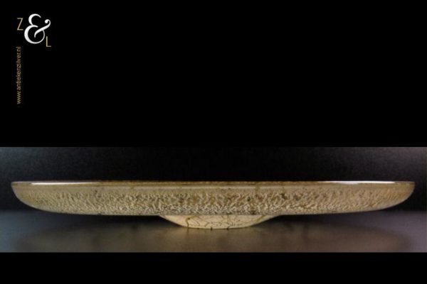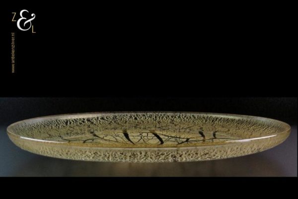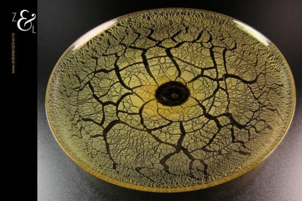 Schitterende gele glazen serica schaal met tincraquelé gemaakt bij de beroemde glasfabriek Leerdam te Leerdam. De mondgeblazen in geel glas uitgevoerde tincraquelé schaal is daar in 1946 gemaakt. Het ontwerp is van de beroemde Nederlandse glaskunstenaar en ontwerper Andries Dirk Copier. Aan de onderzijde van de schaal bevindt zich het geëtste monogram van A.D. Copier. De schaal weegt 1221 gram is 4 cm hoog en heeft een diameter van 34.3 cm. De schaal is afgebeeld op bladzijde 452 afbeelding 1067 Leerdam Serica nummer 70 uitvoering 1946 diameter 340 mm van het boek: Copier Compleet, het oeuvre van A.D. Copier 1901 – 1991. Joan Temminck, Laurens Geurtz.