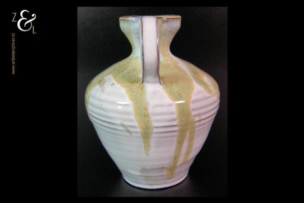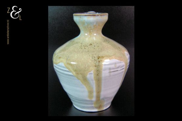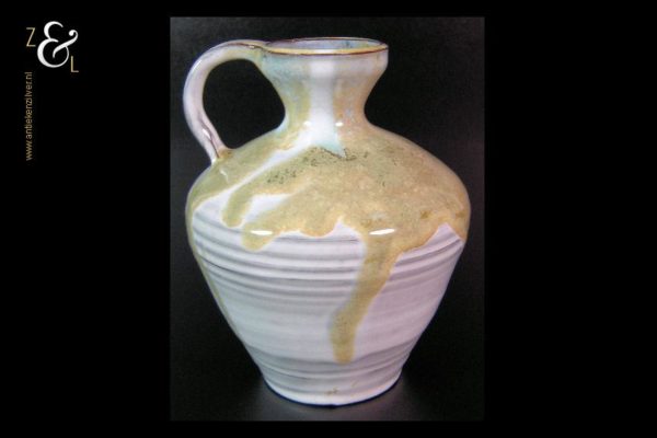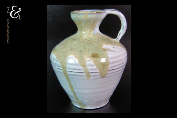 Deze kruik met oor is gemaakt door pottenbakker Laurens Goldewijk. De kruik is aan de onderzijde gesigneerd: LW met daaronder Goldewijk. De geheel geglazuurde aardewerk kruik heeft een diameter van 11.1 cm en is 13.8 cm hoog en weegt 471 gram.