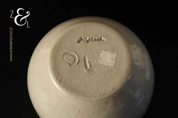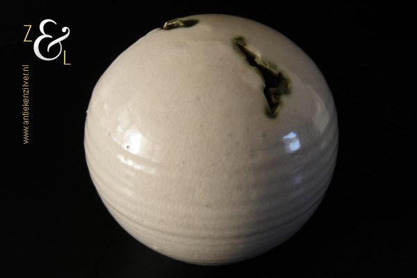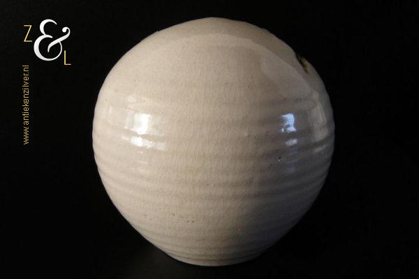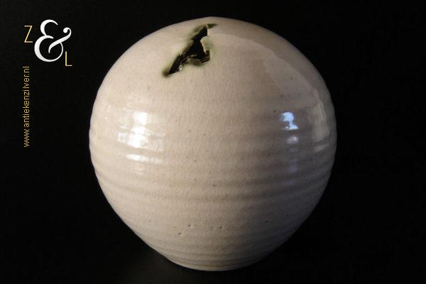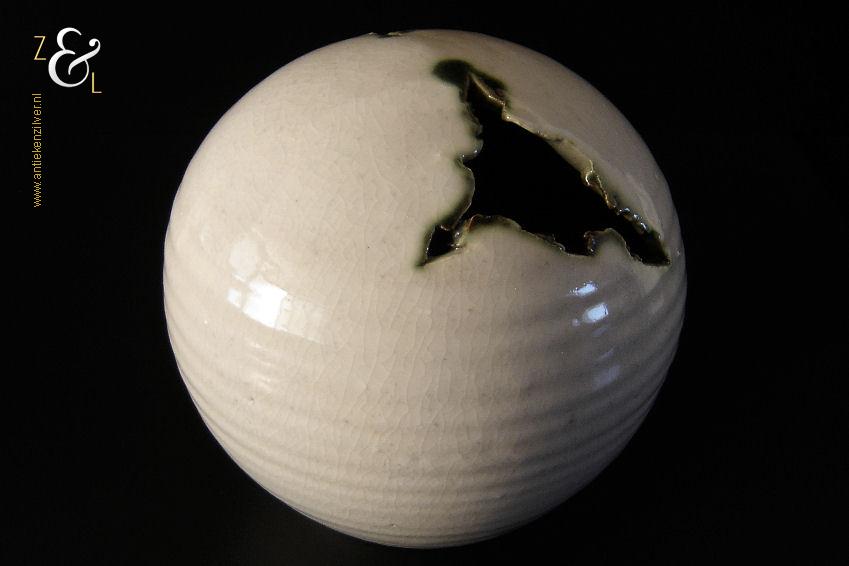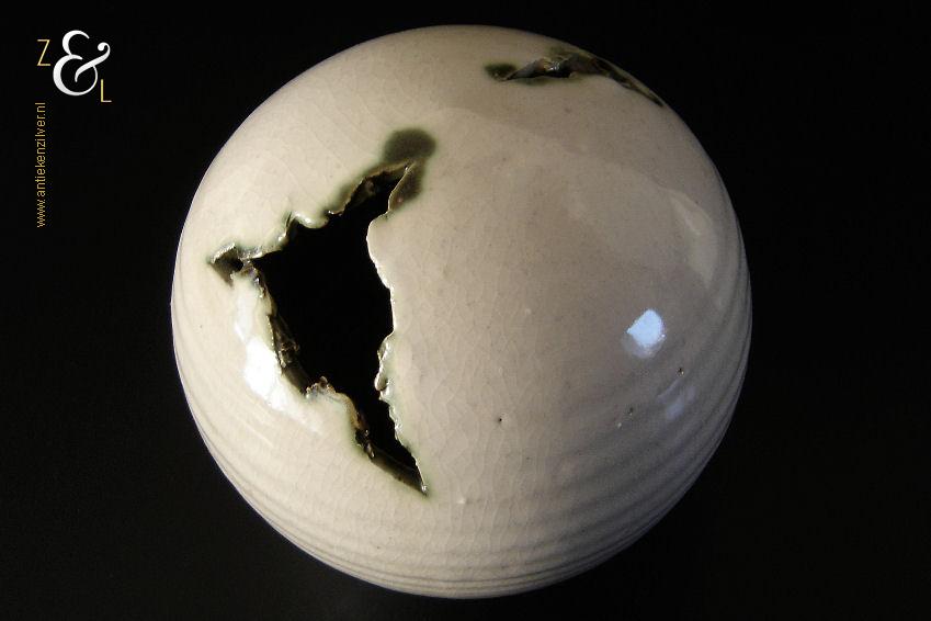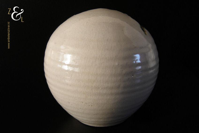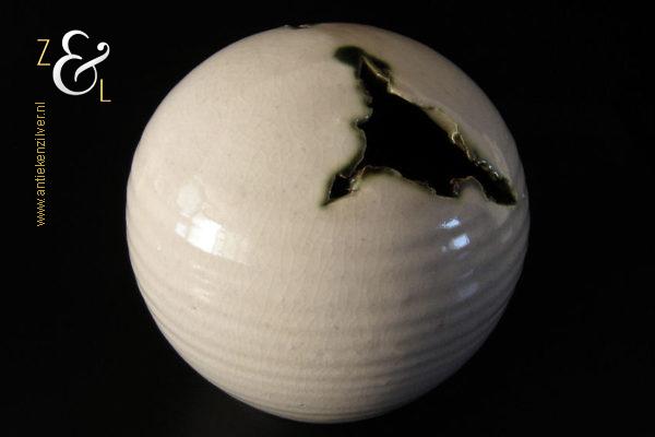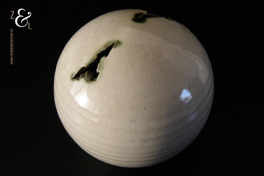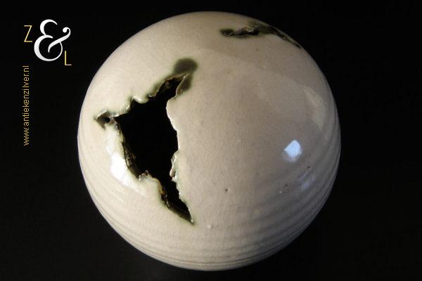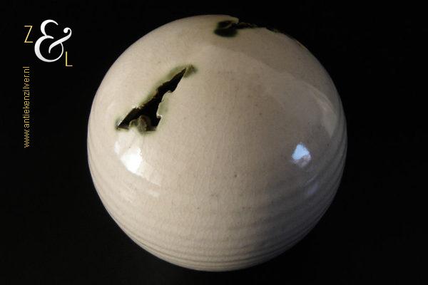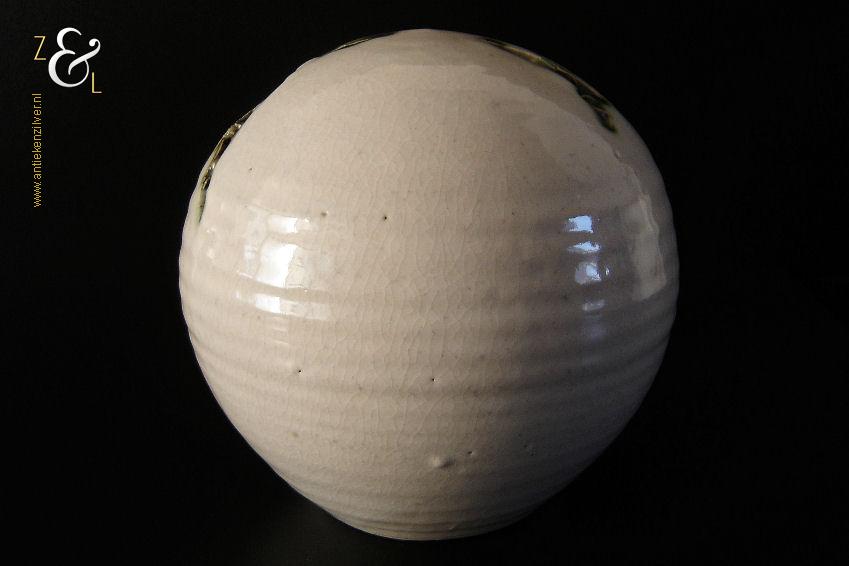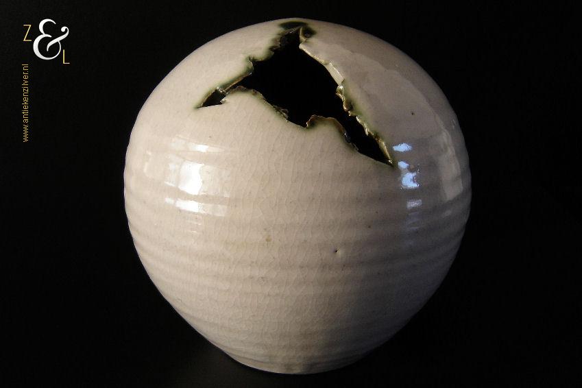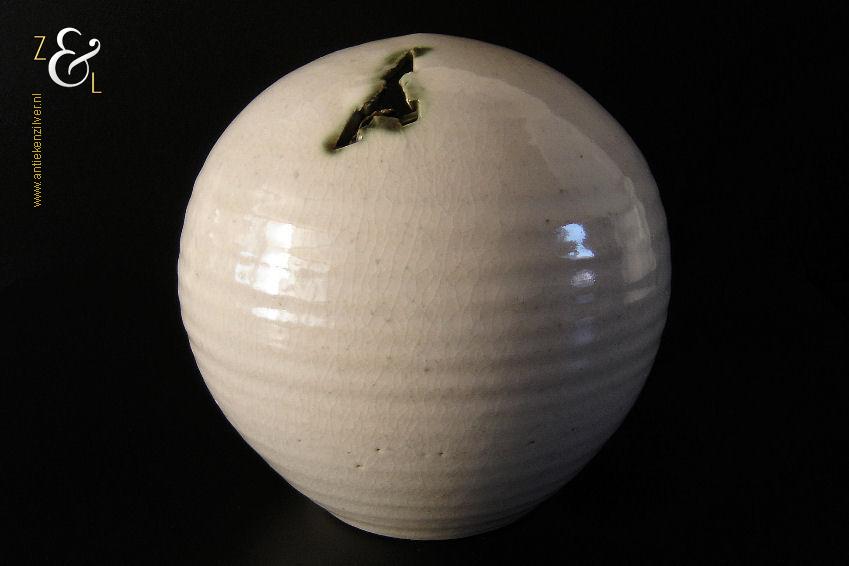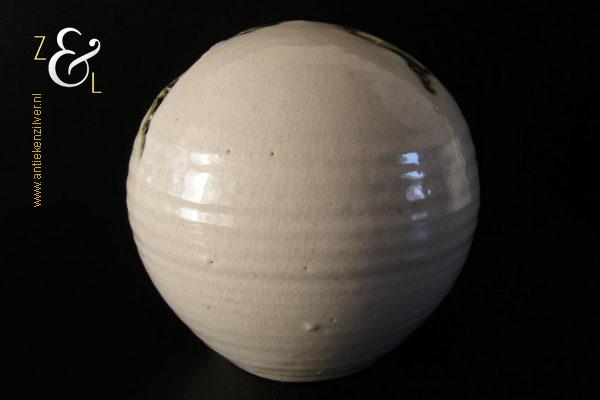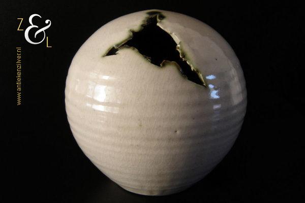 Deze aardewerk / keramiek vaas is gemaakt in Utrecht bij aardewerkfabriek Mobach. De vaas model scheurbol is een ontwerp van Piet Knepper en werd gefabriceerd tussen 1980 en 1989. De grote wit met groen geglazuurde vaas heeft een egale craquelé en heeft aan de onderzijde het stempel van Mobach en de signatuur van Piet Knepper. De vaas weegt 1895 gram en heeft een diameter van 19 cm en is 19 cm hoog.