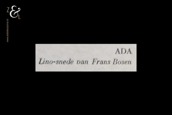 Deze linoleumsnede met de titel “Ada” van Frans Bosen stamt uit het Winterboek 1934 – 1935 van het comité voor arbeid aan werklooze intellectueelen. Uitvoering van de N.V Drukkerij de Spaarnestad, Haarlem. De afmeting van de linoleumsnede is 27 cm bij 20 cm.