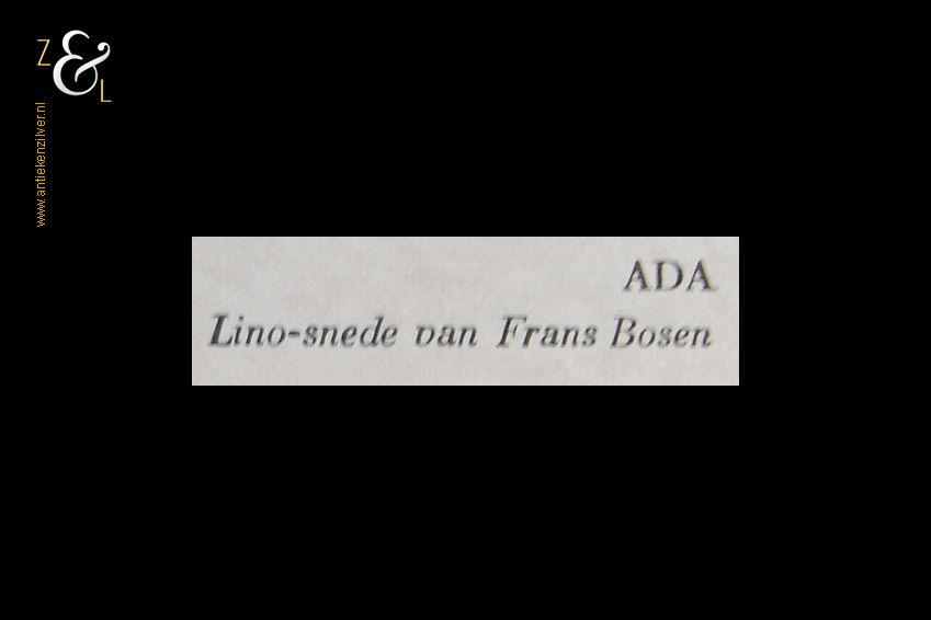 Deze linoleumsnede met de titel “Ada” van Frans Bosen stamt uit het Winterboek 1934 – 1935 van het comité voor arbeid aan werklooze intellectueelen. Uitvoering van de N.V Drukkerij de Spaarnestad, Haarlem. De afmeting van de linoleumsnede is 27 cm bij 20 cm.