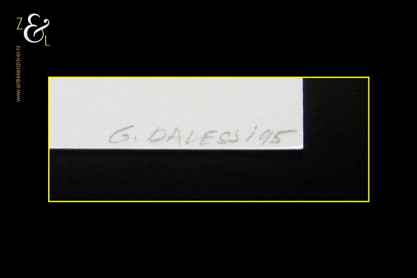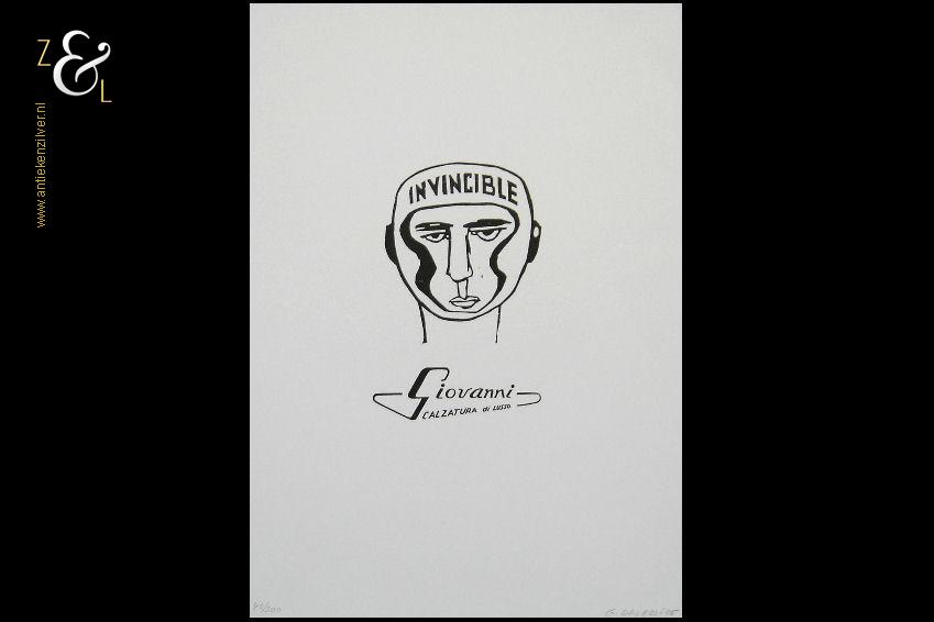 Deze linoleumsnede / lino hoogdruk met de titel “Bokser” is gemaakt door Giovanni Dalessi. De linoleumsnede is met zwarte inkt gedrukt op wit 190 grams papier. De linoleumsnede is met potlood rechtsonder gesigneerd en gedateerd G. Dalessi ’95 en linksonder staat de oplage 40/300 nummer 40 van 300. De linoleumsnede heeft de afmeting van een A4, 29.7 cm lang bij 21 cm breed.