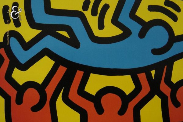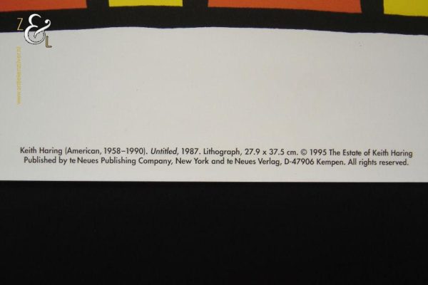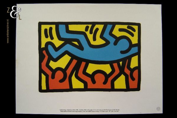 Deze litho van Keith Haring meet aan de buitenzijde 40 cm bij 30 cm de afbeelding is 28 cm bij 19 cm groot. Aan de linkerzijkant in het midden zit aan de rand een vlekje, de rechterbovenhoek is licht gevouwen en rechtsonder zit aan de rand een klein gaatje. Bovenstaande kan opgelost worden met een passe partout. De conditie van de litho is prima.
