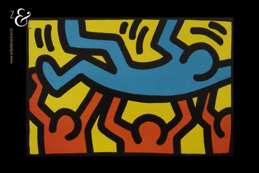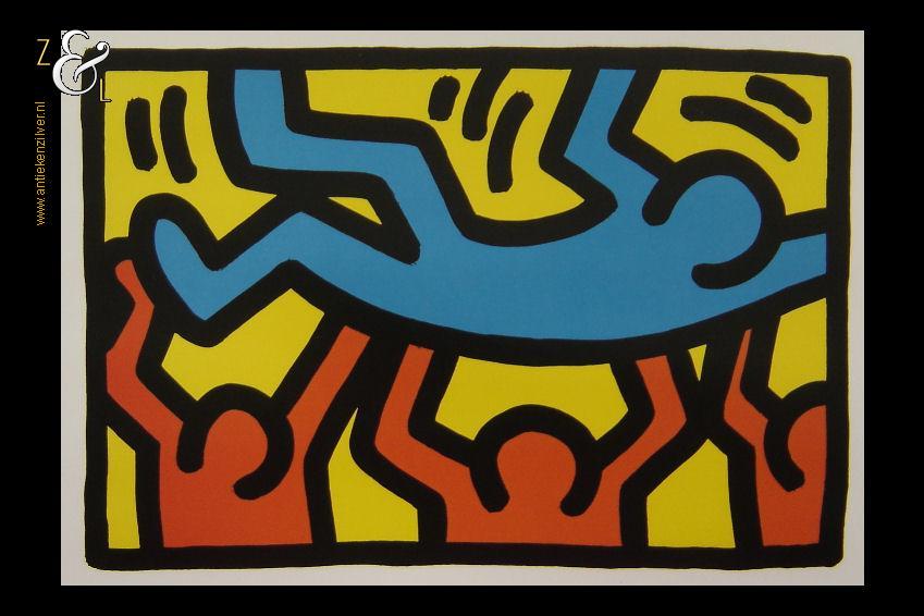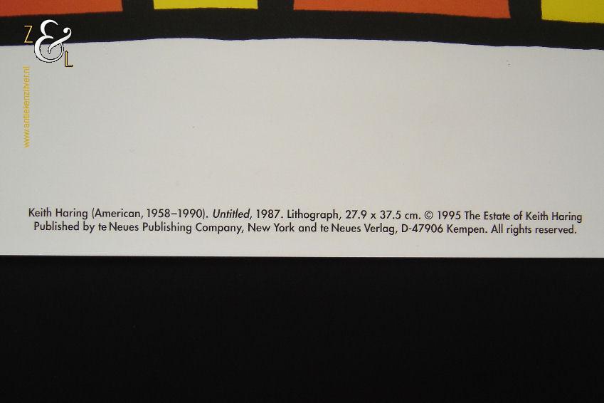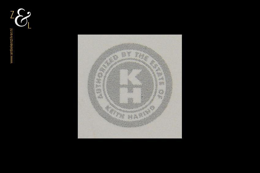 Deze litho van Keith Haring meet aan de buitenzijde 40 cm bij 30 cm de afbeelding is 28 cm bij 19 cm groot. Aan de linkerzijkant in het midden zit aan de rand een vlekje, de rechterbovenhoek is licht gevouwen en rechtsonder zit aan de rand een klein gaatje. Bovenstaande kan opgelost worden met een passe partout. De conditie van de litho is prima.