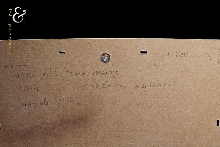 Van het werk is de inlijsting verwijderd, wel is van deze inlijsting de hardboard achterkant aanwezig waarop in potlood geschreven staat: rechtsboven 1 nov 2004, daaronder de titel “Tim als jong meisje”, daaronder het jaartal 2004 en de afmetingen 50 x 65 cm daarnaast aquarel en daaronder de signatuur Jaap de Vries.