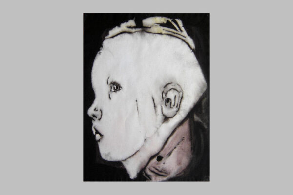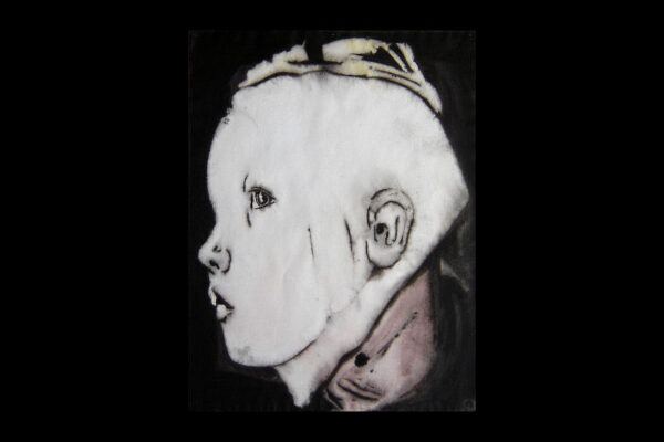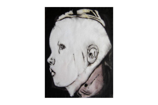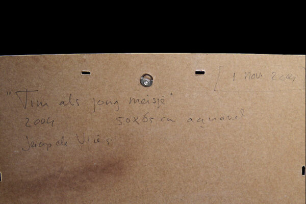 Van het werk is de inlijsting verwijderd, wel is van deze inlijsting de hardboard achterkant aanwezig waarop in potlood geschreven staat: rechtsboven 1 nov 2004, daaronder de titel “Tim als jong meisje”, daaronder het jaartal 2004 en de afmetingen 50 x 65 cm daarnaast aquarel en daaronder de signatuur Jaap de Vries.