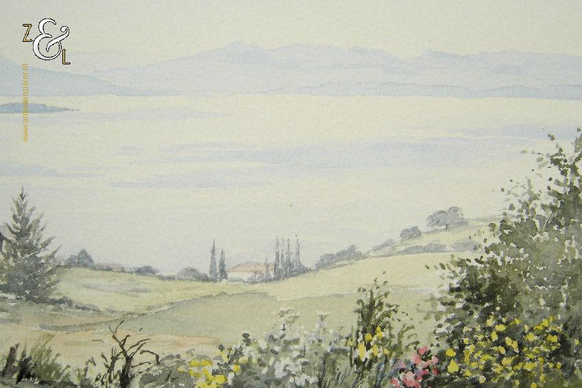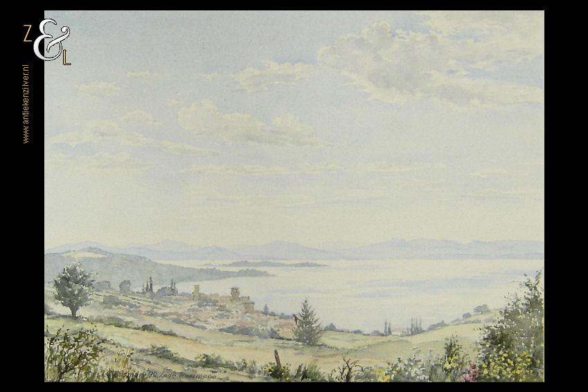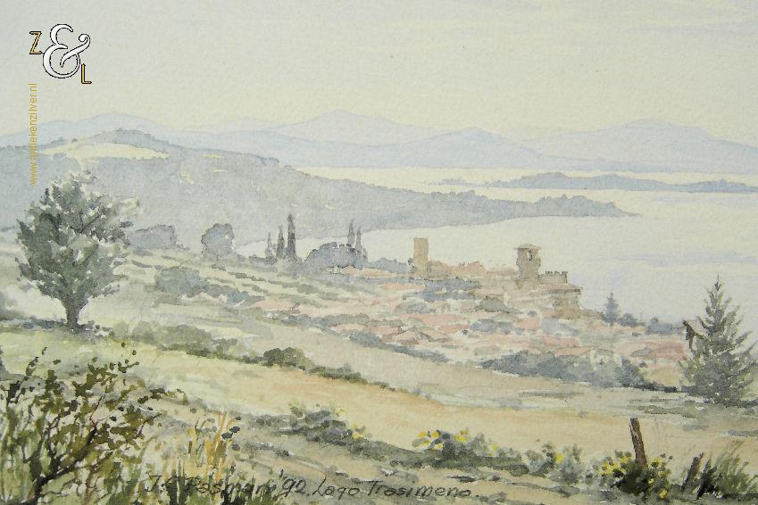 Deze aquarel met de afbeelding van het Lago Trasimeno (Trasimeense meer) in de Italiaanse regio Umbrië is gemaakt door Jan Cornelis Pasman. De aquarel is in potlood linksonder gesigneerd en gedateerd J.C. Pasman ’90 met daarnaast de titel Lago Trasimeno. De aquarel is aan de binnenzijde van het passe partout gemeten 39.7 cm lang bij 29.5 cm breed, de buitenzijde van het passe partout is 49.9 cm lang bij 39.9 cm breed.