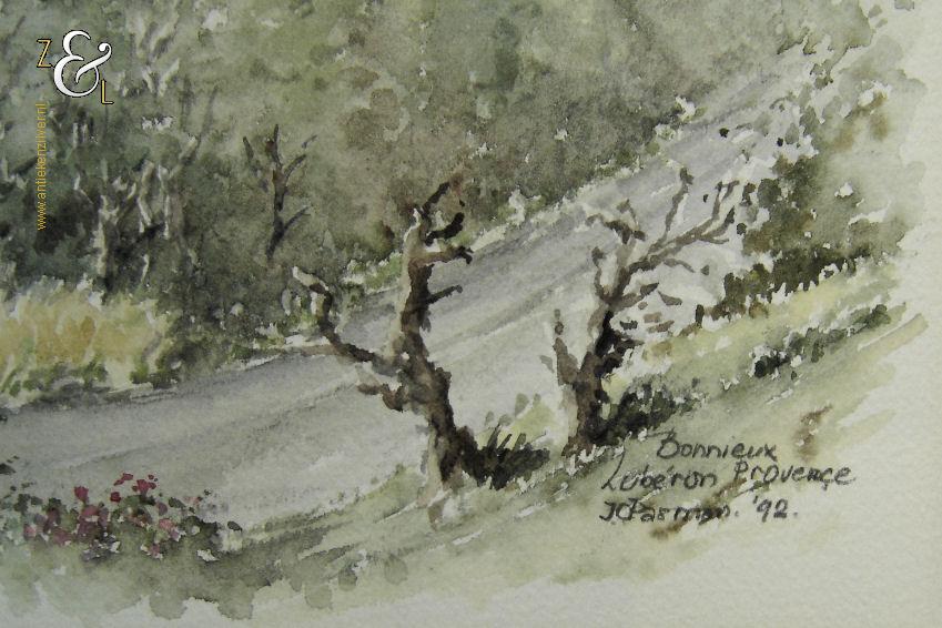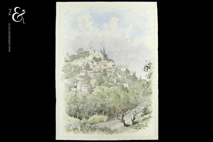Deze aquarel met de afbeelding van het Franse dorpje Bonnieux Lubéron in de Provence is gemaakt door Jan Cornelis Pasman. De aquarel is in potlood rechtsonder gesigneerd en gedateerd J.C. Pasman ’92 met daarboven de titel Bonnieux Lubéron Provence. De aquarel is 38.3 cm lang bij 28.3 cm breed.