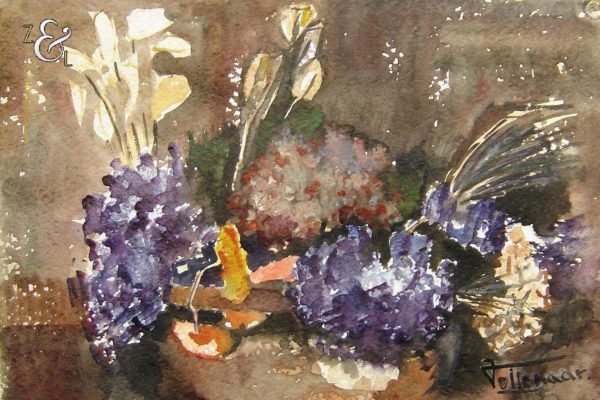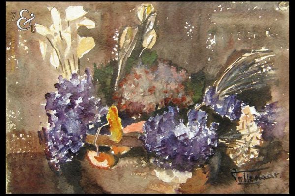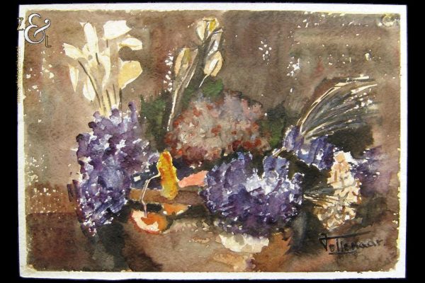 Deze aquarel met de afbeelding van een bloemstilleven is gemaakt door Janny Tollenaar. De aquarel is rechtsonder met aquarelverf gesigneerd: J. Tollenaar en is 51.2 cm lang bij 36.5 cm breed.
