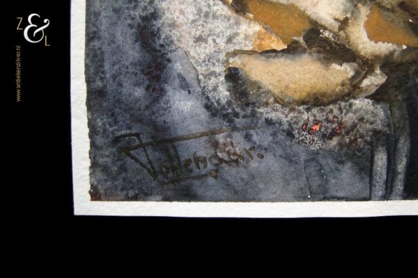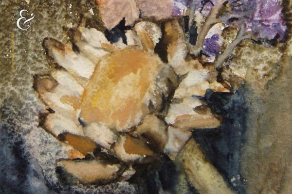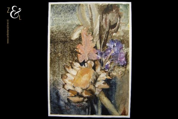 Deze aquarel met de afbeelding van een bloemstilleven met droogbloemen en zonnebloem is gemaakt door Janny Tollenaar. De aquarel is linksonder met aquarelverf gesigneerd: J. Tollenaar en is 50.9 cm lang bij 36.3 cm breed.