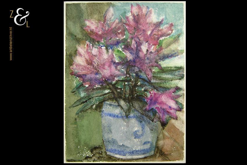 Deze aquarel met de afbeelding van een bloemstilleven met Keulse pot is gemaakt door Janny Tollenaar. De aquarel is rechtsonder met aquarelverf gesigneerd: J. Tollenaar en is 55.7 cm lang bij 42 cm breed.