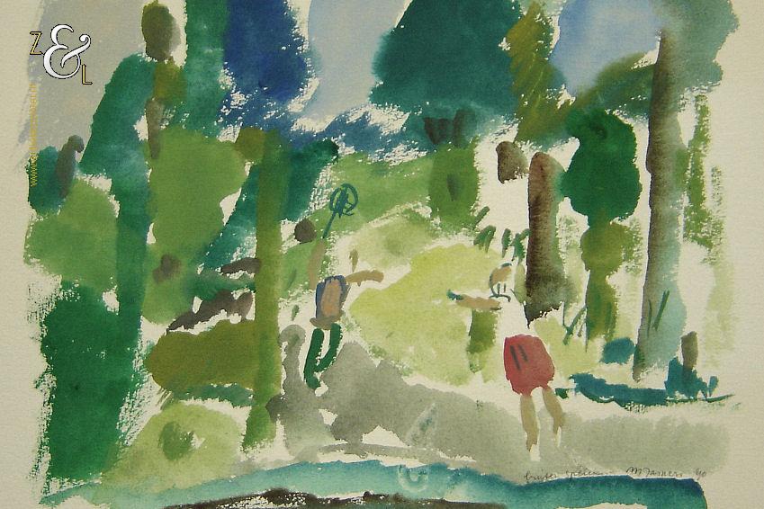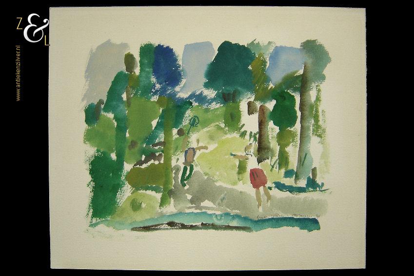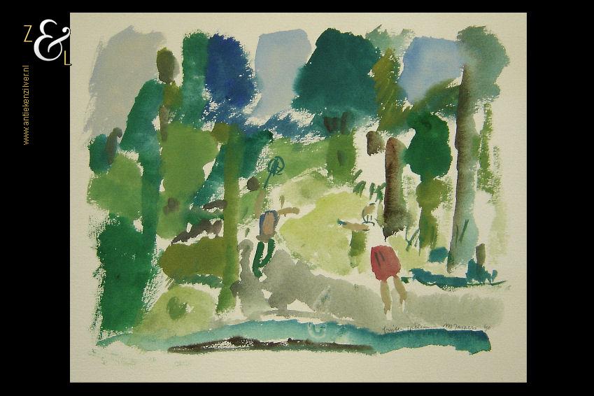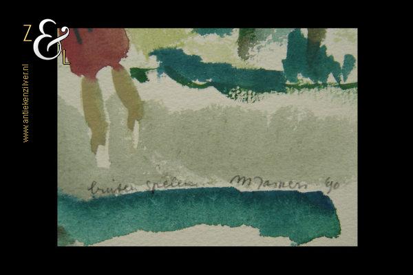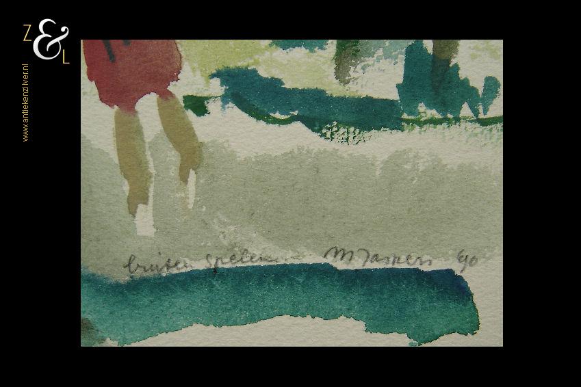 Deze aquarel gemaakt door Marjan Jaspers met de titel “Buiten spelen” is aan de buitenzijde gemeten 36.8 cm lang bij 29.8 cm breed. De aquarel heeft rechtsonder in de aquarel met potlood de titel “buiten spelen” en is tevens gesigneerd en gedateerd met M. Jaspers ’90.