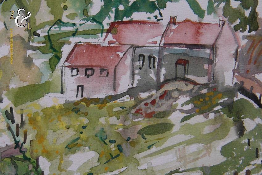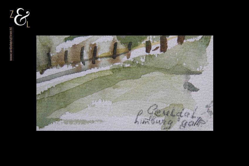 Deze aquarel is gemaakt door Monique Polak en meet 30.9 cm bij 22.7 cm. De aquarel is rechtsonder in potlood gesigneerd en gedateerd met haar initialen MP en Geuldal Limburg ’90.