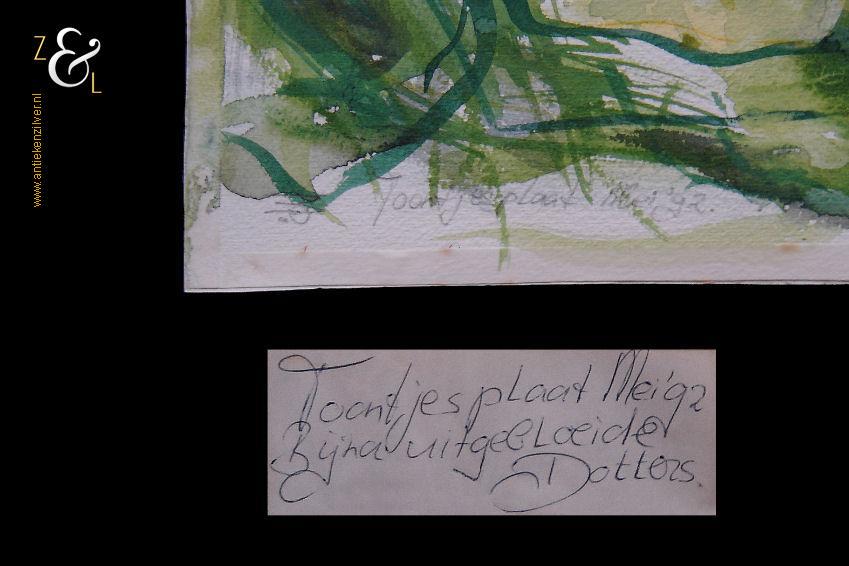Deze aquarel is gemaakt door Monique Polak en meet 65.1 cm bij 48.3 cm. De aquarel is rechtsonder in potlood gesigneerd en gedateerd met haar initialen MP en Toontjesplaat mei 1992. Tevens zat er bij de aquarel een etiket met het opschrift: Toontjesplaat mei ’92 Bijna uitgebloeide dotters. De Toontjesplaat is een gebied gelegen in de Biesbosch.