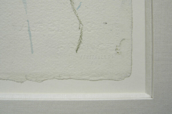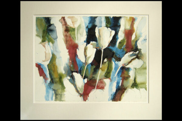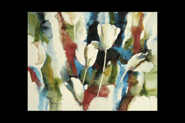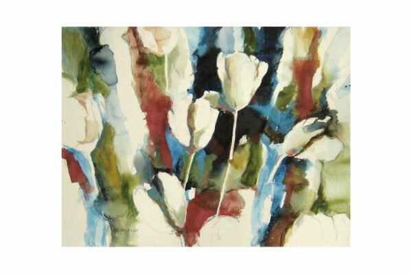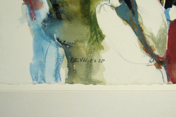 Deze grote aquarel met de afbeelding van tulpen is gemaakt door Paul de Vries. De aquarel is linksonder in potlood gesigneerd en gedateerd: DE Vries 88. Tevens is het geschepte aquarelleerpapier rechtsonder horizontaal gemerkt met een groot onleesbaar (water)merk, met daaronder veritable en een aantal letters / cijfers? Verticaal is het gemerkt met ER D Arones (Arones is een Grieks bedrijf in Kifissia Athene die al meer dan een eeuw in de papiersector vertegenwoordigd is). Het kunstwerk is aan de buitenkant van het passe partout gemeten 98.3 cm lang bij 81.1 cm. De aquarel zelf is 76 cm lang bij 57 cm. Het originele met linnen beklede passe partout heeft een héél lichte egale verkleuring.