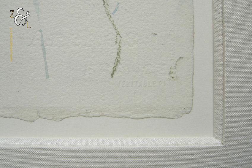 Deze grote aquarel met de afbeelding van tulpen is gemaakt door Paul de Vries. De aquarel is linksonder in potlood gesigneerd en gedateerd: DE Vries 88. Tevens is het geschepte aquarelleerpapier rechtsonder horizontaal gemerkt met een groot onleesbaar (water)merk, met daaronder veritable en een aantal letters / cijfers? Verticaal is het gemerkt met ER D Arones (Arones is een Grieks bedrijf in Kifissia Athene die al meer dan een eeuw in de papiersector vertegenwoordigd is). Het kunstwerk is aan de buitenkant van het passe partout gemeten 98.3 cm lang bij 81.1 cm. De aquarel zelf is 76 cm lang bij 57 cm. Het originele met linnen beklede passe partout heeft een héél lichte egale verkleuring.