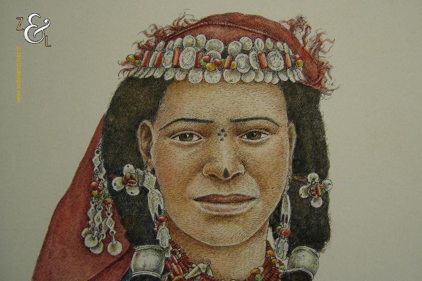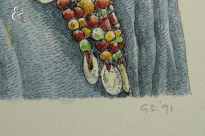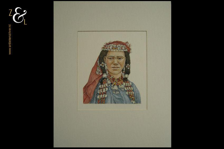 Deze aquarel / pentekening met de titel Marocco / Marokko is gemaakt door Ger Daniëls en meet 26 cm bij 22.5 cm, de buitenzijde van het passe partout meet 50 cm bij 40 cm. De portrettekening is rechtsonder in potlood gesigneerd en gedateerd met initialen G.D. ’91.