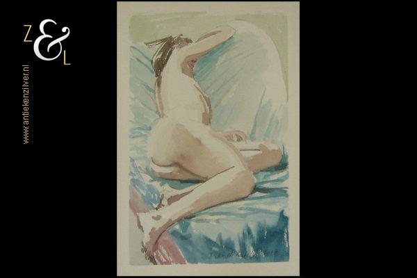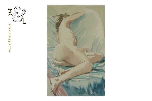 Deze aquarel met de afbeelding van een liggende naakt is in 2015 gemaakt door Piet de Ridder. De in figuratieve stijl uitgevoerde aquarel is rechtsonder in potlood gesigneerd Piet de Ridder 2015. De aquarel van 50.5 cm lang bij 33.8 cm breed is op een stuk zuurvrij karton geplakt van 70 cm lang bij 55 cm breed.