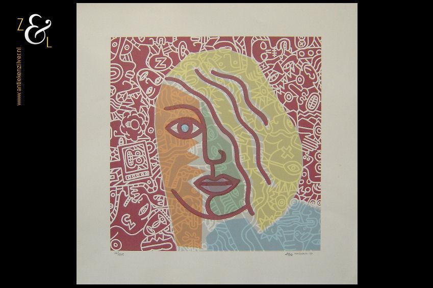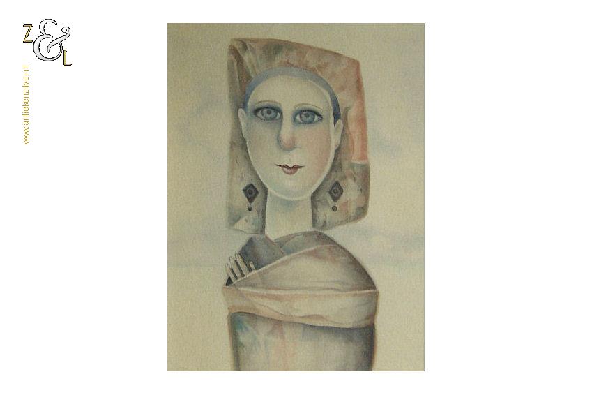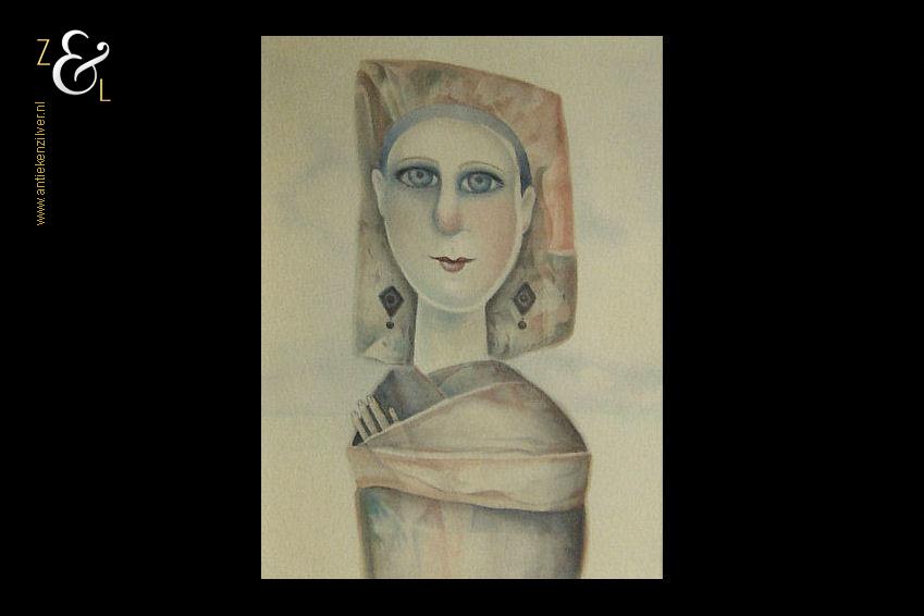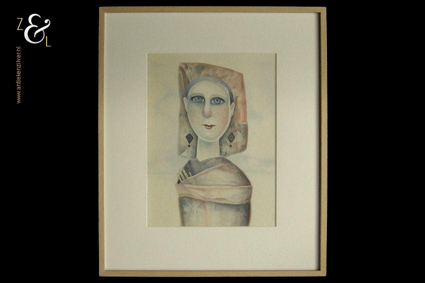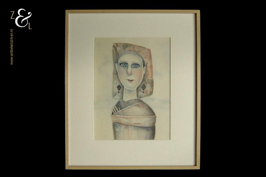 Deze aquarel met de afbeelding van een prinsesje is gemaakt door Poeka Veldman. De aquarel is met met aquarelverf gesigneerd en gedateerd P84. Het kunstwerk is aan de buitenkant van de lijst gemeten 49.2 cm lang bij 39.6 cm breed de aquarel is aan de binnenkant van de passe partout gemeten 31 cm lang bij 22.2 cm breed.