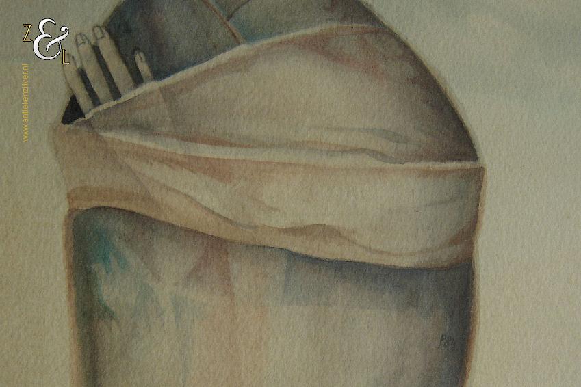 De aquarel heeft een nieuwe houten lijst en is ingelijst door een professionele lijstenmaker.